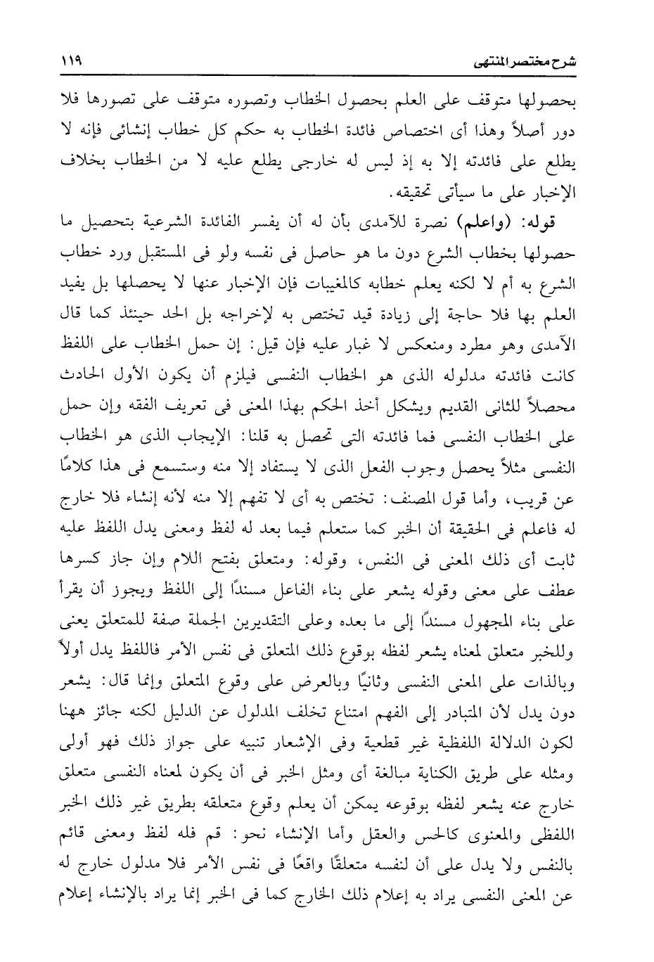 قوله: (واعلم) نصرة للآمدى بأن له أن يفسر الفائدة الشرعية بتحصيل ما حصولها بخطاب الشرع دون ما هو حاصل فى نفسه ولو فى المستقبل ورد خطاب الشرع به أم لا لكنه يعلم خطابه كالمغيبات فإن الإخبار عنها لا يحصلها بل يفيد العلم بها فلا حاجة إلى زيادة قيد تختص به لإخراجه بل الحد حينئذ كما قال الآمدى وهو مطرد ومنعكس لا غبار عليه فإن قيل: إن حمل الخطاب على اللفظ كانت فائدته مدلوله الذى هو الخطاب النفسى فيلزم أن يكون الأول الحادث محصلًا للثانى القديم ويشكل أخذ الحكم بهذا المعنى فى تعريف الفقه وإن حمل على الخطاب النفسى فما فائدته التى تحصل به قلنا: الإيجاب الذى هو الخطاب النفسى مثلًا يحصل وجوب الفعل الذى لا يستفاد إلا منه وستسمع فى هذا كلامًا عن قريب، وأما قول المصنف: تختص به أى لا تفهم إلا منه لأنه إنشاء فلا خارج له فاعلم فى الحقيقة أن الخبر كما ستعلم فيما بعد له لفظ ومعنى يدل اللفظ عليه ثابت أى ذلك المعنى فى النفس، وقوله: ومتعلق بفتح اللام وإن جاز كسرها عطف على معنى وقوله يشعر على بناء الفاعل مسندًا إلى اللفظ ويجوز أن يقرأ على بناء المجهول مسندًا إلى ما بعده وعلى التقديرين الجملة صفة للمتعلق يعنى وللخبر متعلق لمعناه يشعر لفظه بوقوع دلك المتعلق فى نفس الأمر فاللفظ يدل أولًا وبالذات على المعنى النفسى وثانيًا وبالعرض على وقوع المتعلق وإنما قال: يشعر دون يدل لأن المتبادر إلى الفهم امتناع تخلف المدلول عن الدليل لكنه جائز ههنا لكون الدلالة اللفظية غير قطعية وفى الإشعار تنبيه على جواز ذلك فهو أولى ومثله على طريق الكناية مبالغة أى ومثل الخبر فى أن يكون لمعناه النفسى متعلق خارج عنه يشعر لفظه بوقوعه يمكن أن يعلم وقوع متعلقه بطريق غير ذلك الخبر اللفظى والمعنوى كالحس والعقل وأما الإنشاء نحو: قم فله لفظ ومعنى قائم بالنفس ولا يدل على أن لنفسه متعلقًا واقعًا فى نفس الأمر فلا مدلول خارج له عن المعنى النفسى يراد به إعلام ذلك الخارج كما فى الخبر إنما يراد بالإنشاء إعلام