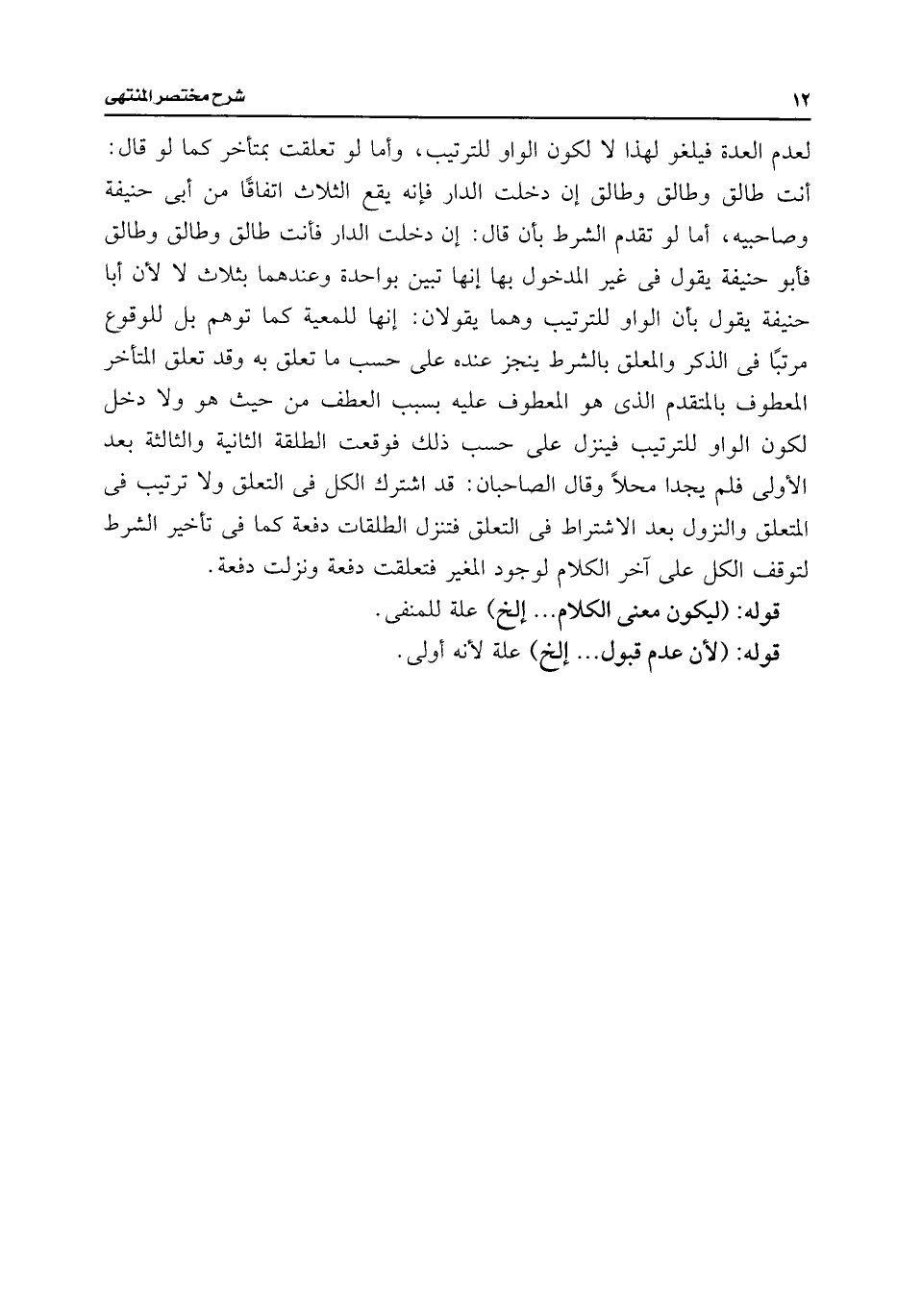 لعدم العدة فيلغو لهذا لا لكون الواو للترتيب، وأما لو تعلقت بمتأخر كما لو قال: أنت طالق وطالق وطالق إن دخلت الدار فإنه يقع الثلاث اتفاقًا من أبى حنيفة وصاحبيه، أما لو تقدم الشرط بأن قال: إن دخلت الدار فأنت طالق وطالق وطالق فأبو حنيفة يقول فى غير المدخول بها إنها تبين بواحدة وعندهما بثلاث لا لأن أبا حنيفة يقول بأن الواو للترتيب وهما يقولان: إنها للمعية كما توهم بل للوقوع مرتبًا فى الذكر والمعلق بالشرط ينجز عنده على حسب ما تعلق به وقد تعلق المتأخر المعطوف بالمتقدم الذى هو المعطوف عليه بسبب العطف من حيث هو ولا دخل لكون الواو للترتيب فينزل على حسب ذلك فوقعت الطلقة الثانية والثالثة بعد الأولى فلم يجدا محلًا وقال الصاحبان: قد اشترك الكل فى التعلق ولا ترتيب فى المتعلق والنزول بعد الاشتراط فى التعلق فتنزل الطلقات دفعة كما فى تأخير الشرط لتوقف الكل على آخر الكلام لوجود المغير فتعلقت دفعة ونزلت دفعة.