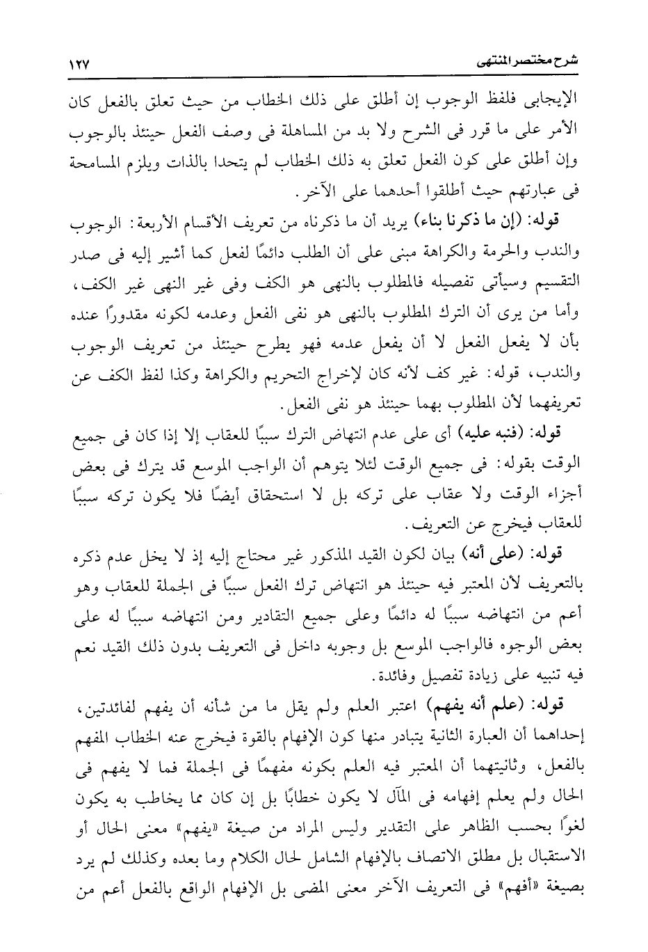 قوله: (إن ما ذكرنا بناء) يريد أن ما ذكرناه من تعريف الأقسام الأربعة: الوجوب والندب والحرمة والكراهة مبنى على أن الطلب دائمًا لفعل كما أشير إليه فى صدر التقسيم وسيأتى تفصيله فالمطلوب بالنهى هو الكف وفى غير النهى غير الكف، وأما من يرى أن الترك المطلوب بالنهى هو نفى الفعل وعدمه لكونه مقدورًا عنده بأن لا يفعل الفعل لا أن يفعل عدمه فهو يطرح حينئذ من تعريف الوجوب والندب، قوله: غير كف لأنه كان لإخراج التحريم والكراهة وكذا لفظ الكف عن تعريفهما لأن المطلوب بهما حينئذ هو نفى الفعل.