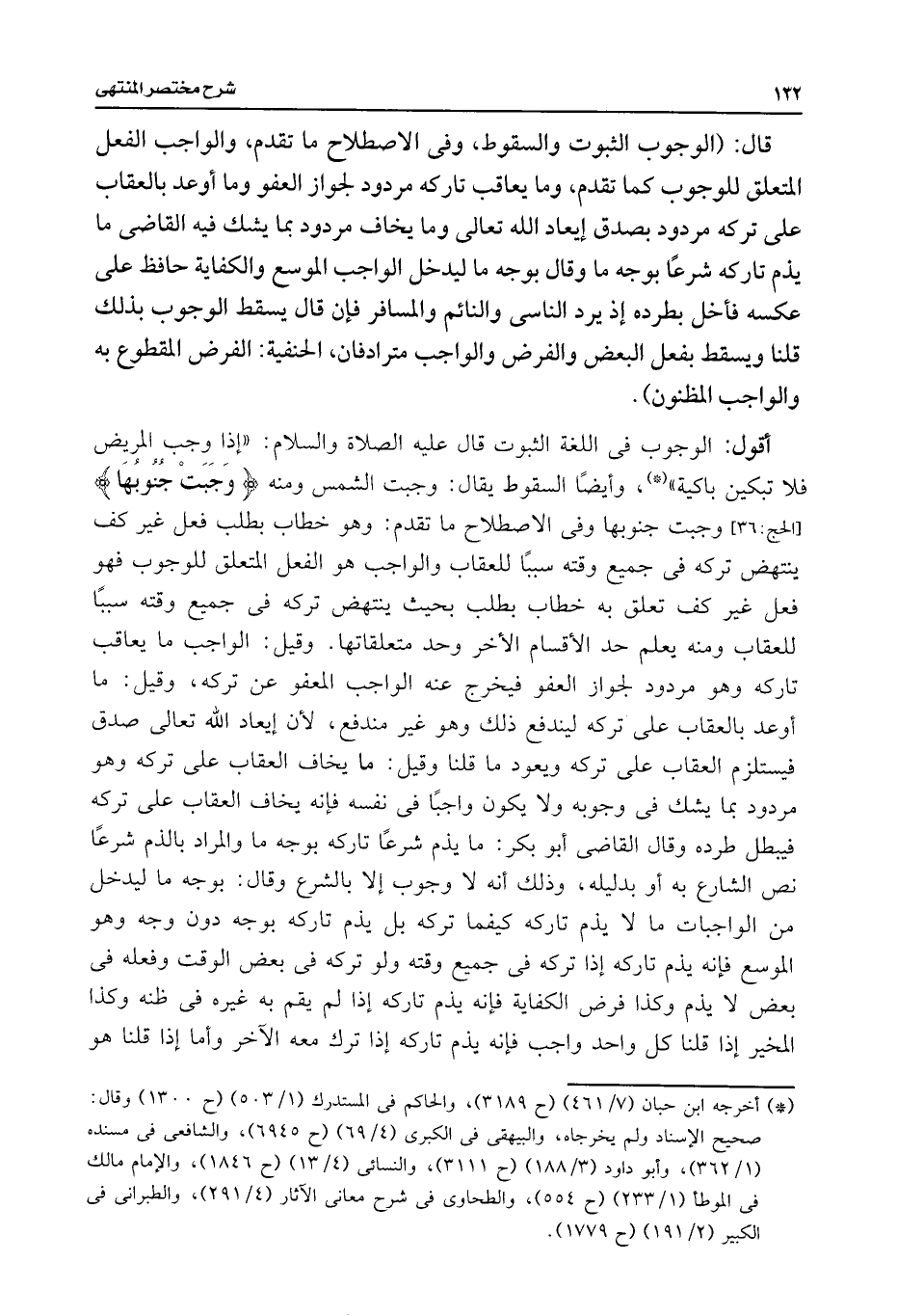 قال: (الوجوب الثبوت والسقوط، وفى الاصطلاح ما تقدم، والواجب الفعل المتعلق للوجوب كما تقدم، وما يعاقب تاركه مردود لجواز العفو وما أوعد بالعقاب على تركه مردود بصدق إيعاد اللَّه تعالى وما يخاف مردود بما يشك فيه القاضى ما يذم تاركه شرعًا بوجه ما وقال بوجه ما ليدخل الواجب الموسع والكفاية حافظ على عكسه فأخل بطرده إذ يرد الناسى والنائم والمسافر فإن قال يسقط الوجوب بذلك قلنا ويسقط بفعل البعض والفرض والواجب مترادفان، الحنفية: الفرض المقطوع به والواجب المظنون).