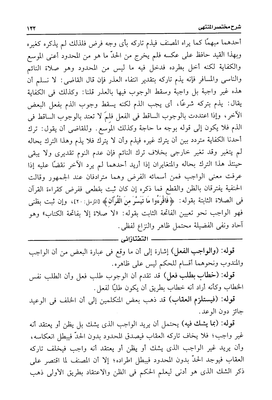 أحدهما مبهمًا كما يراه المصنف فيذم تاركه بأى وجه فرض فلذلك لم يذكره كغيره وبهذا القيد حافظ على عكسه فلم يخرج من الحدّ ما هو من المحدود أعنى الموسع والكفاية لكنه أحل بطرده فدخل فيه ما ليس من المحدود وهو صلاة النائم والناسى والمسافر فإنه يذم تاركه بتقدير انتفاء العذر فإن قال القاضى: لا نسلم أن هذه غير واجبة بل واجبة وسقط الوجوب فيها بالعذر قلنا: وكذلك فى الكفاية يقال: يذم بتركه شرعًا، أى يجب الذم لكنه يسقط وجوب الذم بفعل البعض الآخر، وإذا اعتددت بالوجوب الساقط فى الفعل فلِمَ لا تعتد بالوجوب الساقط فى الذم فلا يكون إلى قوله بوجه ما حاجة وكذلك الموسع. وللقاضى أن يقول: ترك أحدنا الكفاية متردد بين أن يترك غيره فيذم وأن لا يترك فلا يذم وهذا الترك بحاله لم يتغير وقد تغير خارجى بخلاف ترك النائم فإن عدم النوم تقديرى ولا يبقى حينئذ هذا الترك بحاله والمتغايران إذا أريد أحدهما لم يرد الآخر نقضًا عليه إذا عرفت معنى الواجب فمن أسمائه الفرض وهما مترادفان عند الجمهور وقالت الحنفية يفترقان بالظن والقطع فما ذكره إن كان ثبت بقطعى ففرض كقراءة القرآن فى الصلاة الثابتة بقوله: {فَاقْرَءُوا مَا تَيَسَّرَ مِنَ الْقُرْآنِ} [المزمل: ٢٠] وإن ثبت بظنى فهو الواجب نحو تعيين الفاتحة الثابت بقوله: "لا صلاة إلا بفاتحة الكتاب" وهو آحاد ونفى الفضيلة محتمل ظاهر والنزاع لفظى.