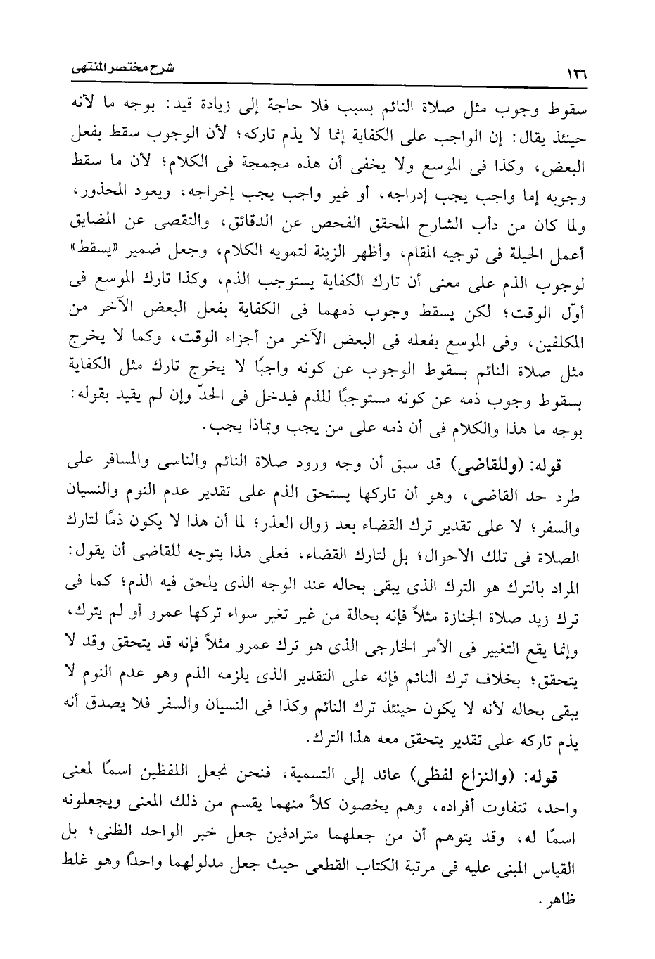 سقوط وجوب مثل صلاة النائم بسبب فلا حاجة إلى زيادة قيد: بوجه ما لأنه حينئذ يقال: إن الواجب على الكفاية إنما لا يذم تاركه؛ لأن الوجوب سقط بفعل البعض، وكذا فى الموسع ولا يخفى أن هذه مجمجة فى الكلام؛ لأن ما سقط وجوبه إما واجب يجب إدراجه، أو غير واجب يجب إخراجه، ويعود المحذور، ولما كان من دأب الشارح المحقق الفحص عن الدقائق، والتقصى عن المضايق أعمل الحيلة فى توجيه المقام، وأظهر الزينة لتمويه الكلام، وجعل ضمير "يسقط" لوجوب الذم على معنى أن تارك الكفاية يستوجب الذم، وكذا تارك الموسع فى أول الوقت؛ لكن يسقط وجوب ذمهما فى الكفاية بفعل البعض الآخر من المكلفين، وفى الموسع بفعله فى البعض الآخر من أجزاء الوقت، وكما لا يخرج مثل صلاة النائم بسقوط الوجوب عن كونه واجبًا لا يخرج تارك مثل الكفاية بسقوط وجوب ذمه عن كونه مستوجبًا للذم فيدخل فى الحدّ وإن لم يقيد بقوله: بوجه ما هذا والكلام فى أن ذمه على من يجب وبماذا يجب.