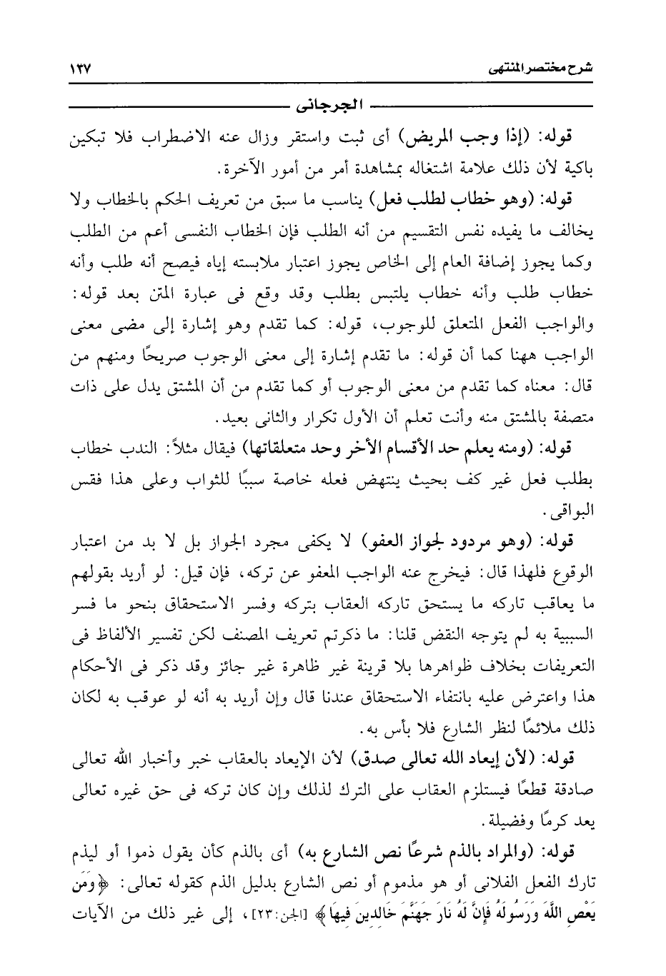 قوله: (والمراد بالذم شرعًا نص الشارع به) أى بالذم كأن يقول ذموا أو ليذم تارك الفعل الفلانى أو هو مذموم أو نص الشارع بدليل الذم كقوله تعالى: {وَمَنْ يَعْصِ اللَّهَ وَرَسُولَهُ فَإِنَّ لَهُ نَارَ جَهَنَّمَ خَالِدِينَ فِيهَا} [الجن: ٢٣]، إلى غير ذلك من الآيات