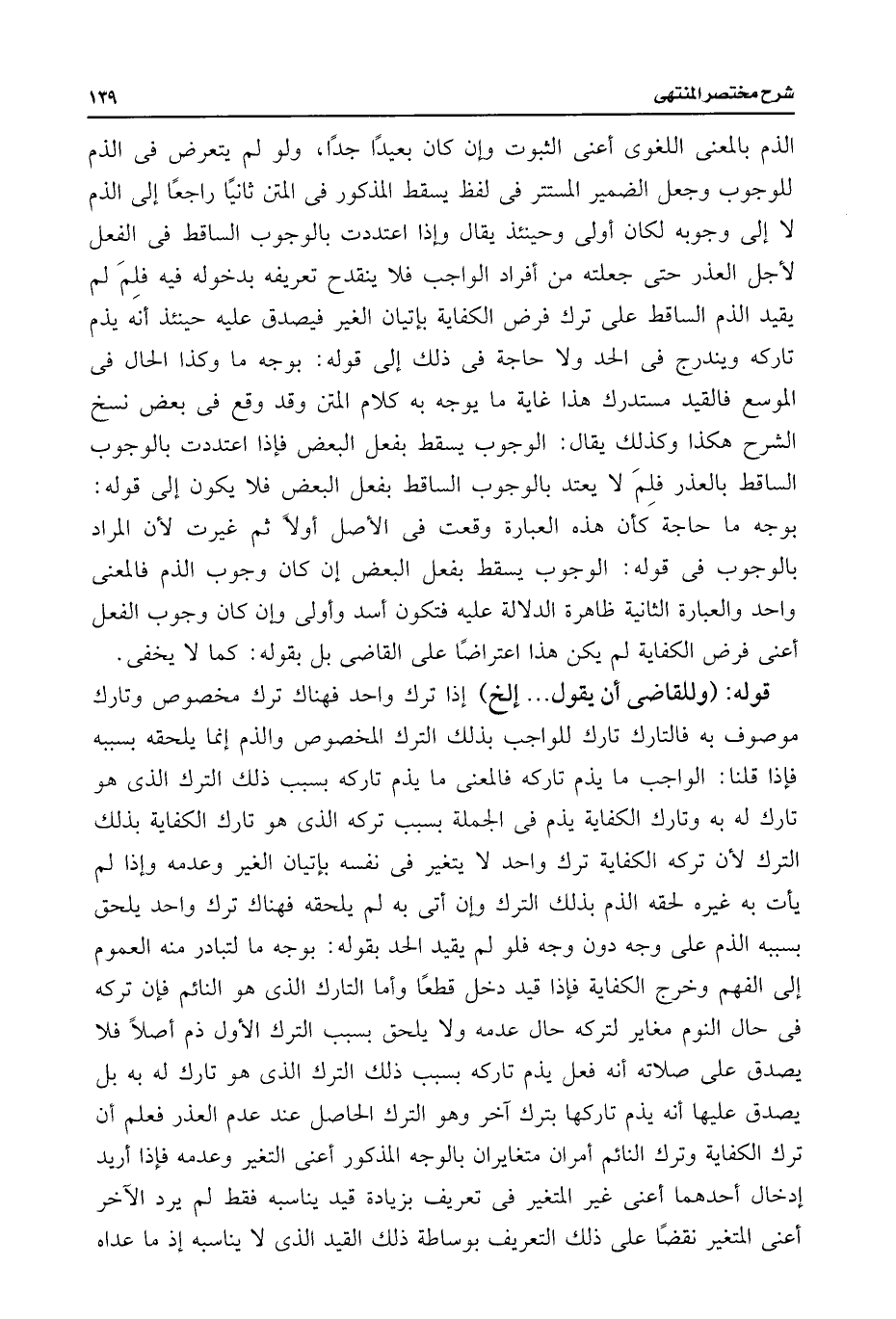 الذم بالمعنى اللغوى أعنى الثبوت وإن وإن بعيدًا جدًا, ولو لم يتعرض فى الذم للوجوب وجعل الضمير المستتر فى لفظ يسقط المذكور فى المتن ثانيًا راجعًا إلى الذم لا إلى وجوبه لكان أولى وحينئذ يقال وإذا اعتددت بالوجوب الساقط فى الفعل لأجل العذر حتى جعلته من أفراد الواجب فلا ينقدح تعريفه بدخوله فيه فلِمَ لم يقيد الذم الساقط على ترك فرض الكفاية بإتيان الغير فيصدق عليه حينئذ أنه يذم تاركه ويندرج فى الحد ولا حاجة فى ذلك إلى قوله: بوجه ما وكذا الحال فى الموسع فالقيد مستدرك هذا غاية ما يوجه به كلام المتن وقد وقع فى بعض نسخ الشرح هكذا وكذلك يقال: الوجوب يسقط بفعل البعض فإذا اعتددت بالوجوب الساقط بالعذر فلِمَ لا يعتد بالوجوب الساقط بفعل البعض فلا يكون إلى قوله: بوجه ما حاجة كأن هذه العبارة وقعت فى الأصل أولًا ثم غيرت لأن المراد بالوجوب فى قوله: الوجوب يسقط بفعل البعض إن كان وجوب الذم فالمعنى واحد والعبارة الثانية ظاهرة الدلالة عليه فتكون أسد وأولى وإن كان وجوب الفعل أعنى فرض الكفاية لم يكن هذا اعتراضًا على القاضى بل بقوله: كما لا يخفى.