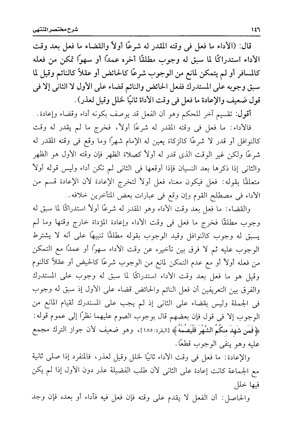 فالأداء: ما فعل فى وقته المقدر له شرعًا أولًا، فخرج ما لم يقدر له وقت كالنوافل أو قدر لا شرعًا كالزكاة يعين له الإمام شهرًا وما وقع فى وقته المقدر له شرعًا ولكن غير الوقت الذى قدر له أولًا كصلاة الظهر فإن وقته الأول هو الظهر والثانى إذا ذكرها بعد النسيان فإذا أوقعها فى الثانى لم تكن أداء وليس قوله أولًا متعلقًا بقوله: فعل فيكون معناه فعل أولًا لتخرج الإعادة لأن الإعادة قسم من الأداء فى مصطلح القوم وإن وقع فى عبارات بعض المتأخرين خلافه.