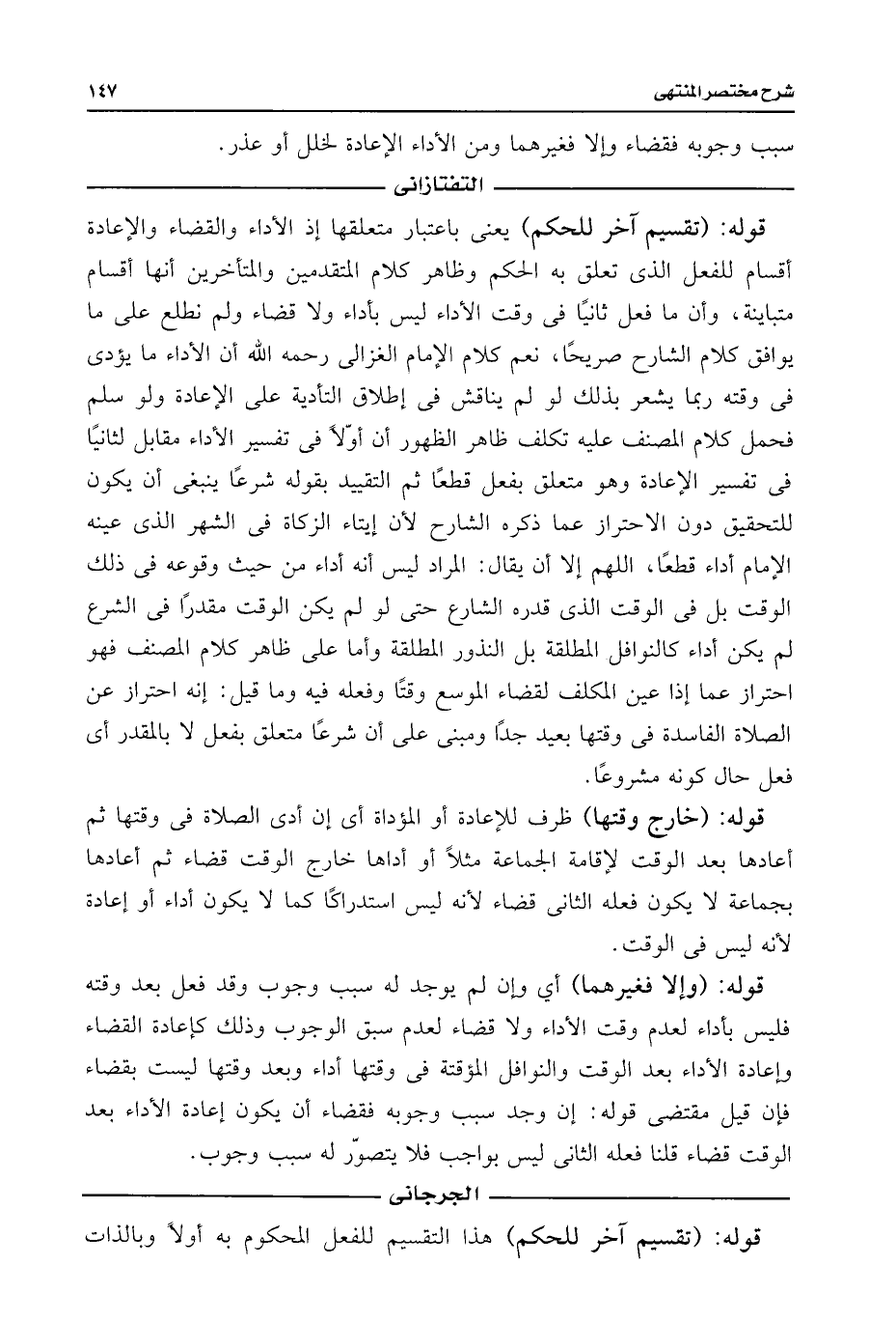 قوله: (تقسيم آخر للحكم) يعنى باعتبار متعلقها إذ الأداء والقضاء والإعادة أقسام للفعل الذى تعلق به الحكم وظاهر كلام المتقدمين والمتأخرين أنها أقسام متباينة، وأن ما فعل ثانيًا فى وقت الأداء ليس بأداء ولا قضاء ولم نطلع على ما يوافق كلام الشارح صريحًا، نعم كلام الإمام الغزالى رحمه اللَّه أن الأداء ما يؤدى فى وقته ربما يشعر بذلك لو لم يناقش فى إطلاق التأدية على الإعادة ولو سلم فحمل كلام المصنف عليه تكلف ظاهر الظهور أن أوّلًا فى تفسير الأداء مقابل لثانيًا فى تفسير الإعادة وهو متعلق بفعل قطعًا ثم التقييد بقوله شرعًا ينبغى أن يكون للتحقيق دون الاحتراز عما ذكره الشارح لأن إيتاء الزكاة فى الشهر الذى عينه الإمام أداء قطعًا، اللهم إلا أن يقال: المراد ليس أنه أداء من حيث وقوعه فى ذلك الوقت بل فى الوقت الذى قدره الشارع حتى لو لم يكن الوقت مقدرًا فى الشرع لم يكن أداء كالنوافل المطلقة بل النذور المطلقة وأما على ظاهر كلام المصنف فهو احتراز عما إذا عين المكلف لقضاء الموسع وقتًا وفعله فيه وما قيل: إنه احتراز عن الصلاة الفاسدة فى وقتها بعيد جدًا ومبنى على أن شرعًا متعلق بفعل لا بالمقدر أى فعل حال كونه مشروعًا.
