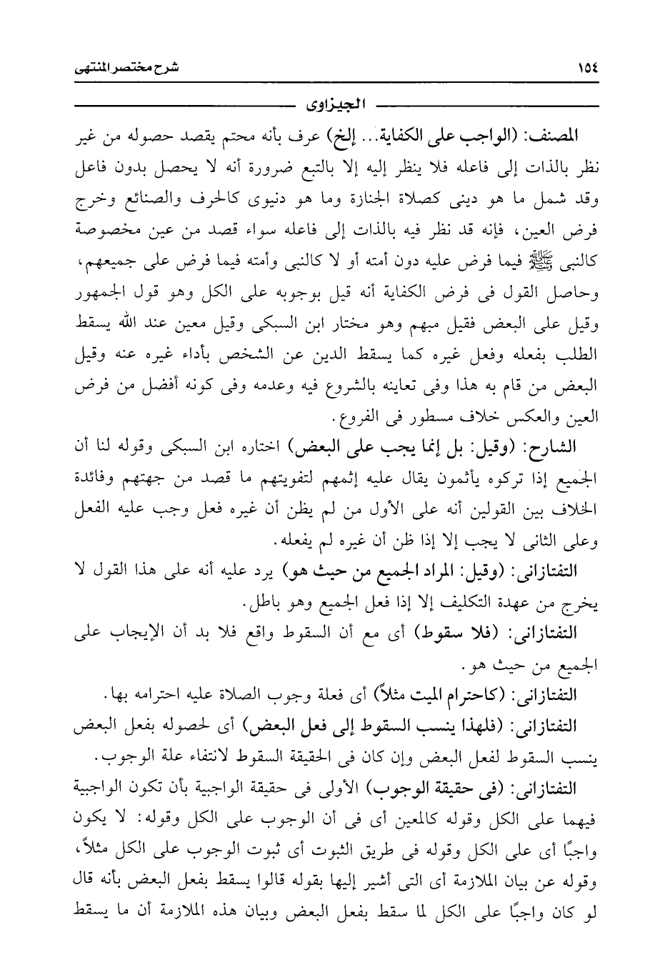 التفتازانى: (فى حقيقة الوجوب) الأولى فى حقيقة الواجبية بأن تكون الواجبية فيهما على الكل وقوله كالمعين أى فى أن الوجوب على الكل وقوله: لا يكون واجبًا أى على الكل وقوله فى طريق الثبوت أى ثبوت الوجوب على الكل مثلًا، وقوله عن بيان الملازمة أى التى أشير إليها بقوله قالوا يسقط بفعل البعض بأنه قال لو كان واجبًا على الكل لما سقط بفعل البعض وبيان هذه الملازمة أن ما يسقط