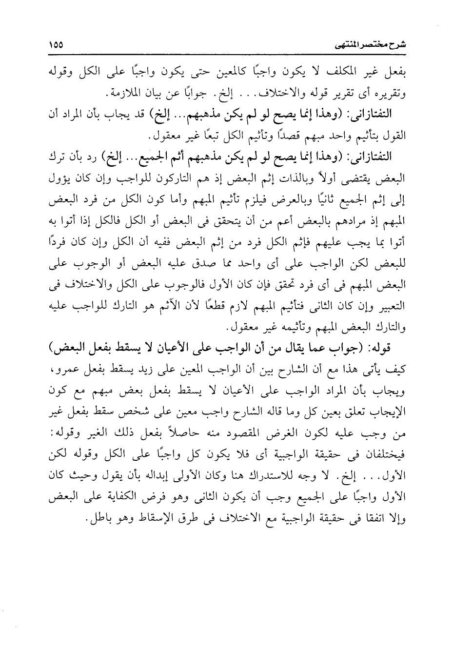 التفتازانى: (وهذا إنما يصح لو لم يكن مذهبهم أثم الجميع. . . إلخ) رد بأن ترك البعض يقتضى أولًا وبالذات إثم البعض إذ هم التاركون للواجب وإن كان يؤول إلى إثم الجميع ثانيًا وبالعرض فيلزم تأثيم المبهم وأما كون الكل من فرد البعض المبهم إذ مرادهم بالبعض أعم من أن يتحقق فى البعض أو الكل فالكل إذا أتوا به أتوا بما يجب عليهم فإثم الكل فرد من إثم البعض فيه أن الكل وإن كان فردًا للبعض لكن الواجب على أى واحد مما صدق عليه البعض أو الوجوب على البعض المبهم فى أى فرد تحقق فإن كان الأول فالوجوب على الكل والاختلاف فى التعبير وإن كان الثانى فتأثيم المبهم لازم قطعًا لأن الآثم هو التارك للواجب عليه والتارك البعض المبهم وتأثيمه غير معقول.