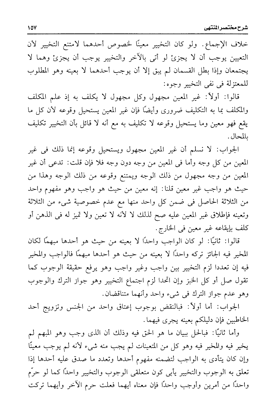 قالوا: ثانيًا: لو كان الواجب واحدًا لا بعينه من حيث هو أحدها مبهمًا لكان المخير فيه الجائز تركه واحدًا لا بعينه من حيث هو أحدها مبهمًا فالواجب والمخير فيه إن تعددا لزم التخيير بين واجب وغير واجب وهو يرفع حقيقة الوجوب كما تقول صل أو كل الخبز وإن اتحدا لزم اجتماع التخيير وهو جواز الترك والوجوب وهو عدم جواز الترك فى شئ واحد وأنهما متناقضان.