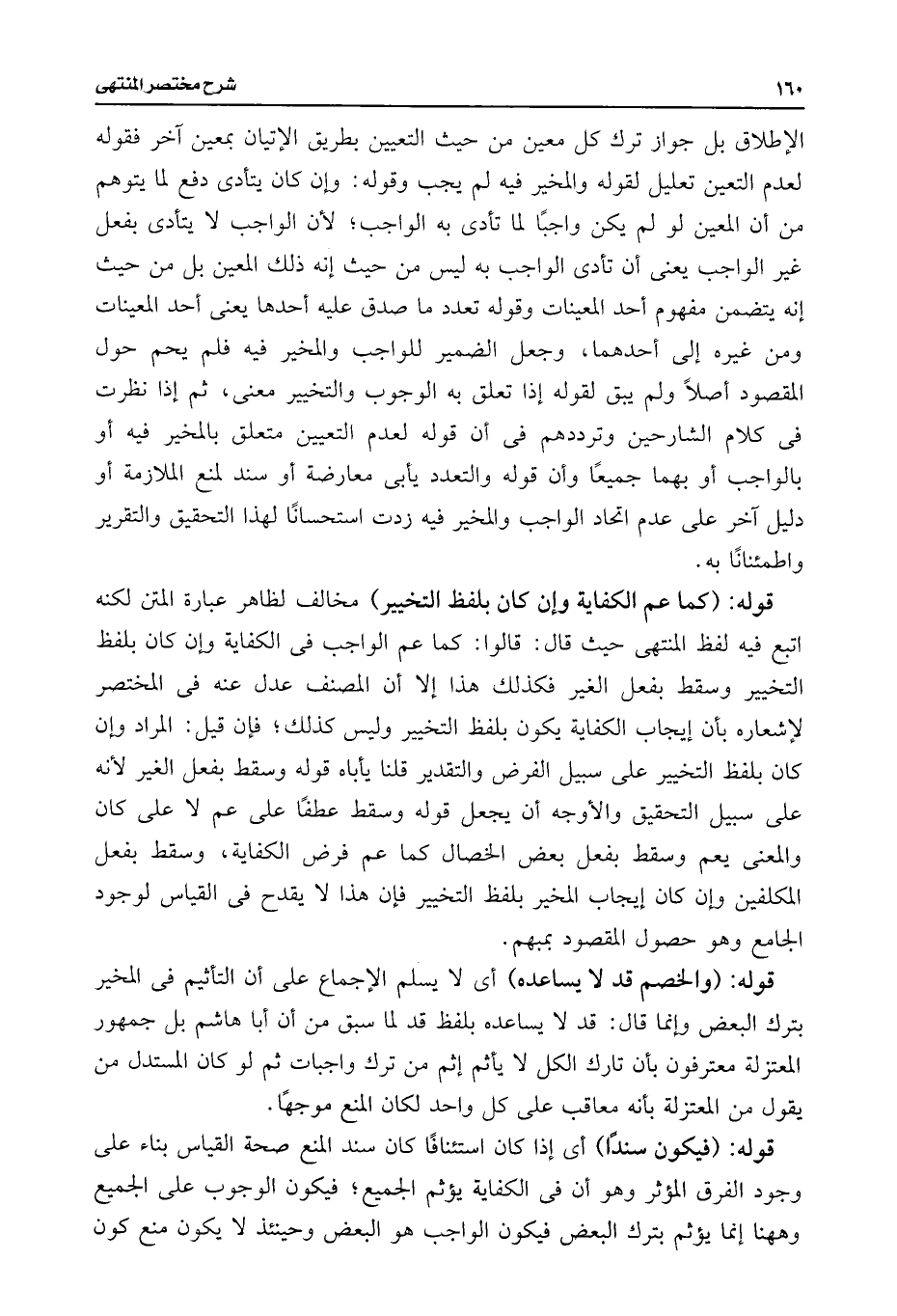 قوله: (كما عم الكفاية وإن كان بلفظ التخيير) مخالف لظاهر عبارة المتن لكنه اتبع فيه لفظ المنتهى حيث قال: قالوا: كما عم الواجب فى الكفاية وإن كان بلفظ التخيير وسقط بفعل الغير فكذلك هذا إلا أن المصنف عدل عنه فى المختصر لإشعاره بأن إيجاب الكفاية يكون بلفظ التخيير وليس كذلك؛ فإن قيل: المراد وإن كان بلفظ التخيير على سبيل الفرض والتقدير قلنا يأباه قوله وسقط بفعل الغير لأنه على سبيل التحقيق والأوجه أن يجعل قوله وسقط عطفًا على عم لا على كان والمعنى يعم وسقط بفعل بعض الخصال كما عم فرض الكفاية، وسقط بفعل المكلفين وإن كان البخاري المخير بلفظ التخيير فإن هذا لا يقدح فى القياس لوجود الجامع وهو حصول المقصود بمبهم.