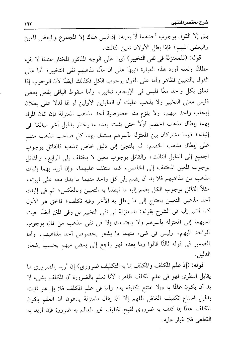 قوله: (للمعتزلة فى نفى التخيير) أى: على الوجه المذكور المختار عندنا لا نفيه مطلقًا ولعله أورد هذه العبارة تنبيهًا على أن مآل مذهبهم نفى التخيير؛ أما على القول بالتعيين فظاهر وأما على القول بوجوب الكل فكذلك أيضًا لأن الوجوب إذا تعلق بكل واحد معًا فليس فى الإيجاب تخيير، وأما سقوط الباقى بفعل بعض فليس معنى التخيير ولا يذهب عليك أن الدليلين الأولين لو تما لدلا على بطلان إيجاب واحد مبهم، ولا يلزم منه خصوصية أحد مذاهب المعتزلة فإن كان المراد بهما إبطال مذهب الخصم أوّلًا حتى يثبت بعده ما يختار بدليل آخر مبالغة فى إثباته؛ فهما متركان بين المعتزلة بأسرهم يستدل بهما كل صاحب مذهب منهم على إبطال مذهب الخصم، ثم يلتجئ إلى دليل خاص بمذهبه فالقائل بوجوب الجميع إلى الدليل الثالث، والقائل بوجوب معين لا يختلف إلى الرابع، والقائل بوجوب المعين المختلف إلى الخامس، كما ستقف عليهما، وإن أريد بهما إثبات مذهب من مذاهبهم فلا بد أن يضم إلى كل واحد منهما ما يدل معه على ثبوته، مثلًا القائل بوجوب الكل يضم إليه ما أبطلنا به التعيين وبالعكس؛ ثم فى إثبات أحد مذهبى التعيين يحتاج إلى ما يبطل به الآخر وفيه تكلف؛ فالحق هو الأول كما أشير إليه فى الشرح بقوله: للمعتزلة فى نفى التخيير بل وفى المتن أيضًا حيث نسبهما إلى المعتزلة بأسرهم ولا يجتمعان إلا فى نفى مذهب من قال بوجوب الواحد المبهم، وليس فى شئ منهما ما يشعر بخصوص أحد مذاهبهم، وأما الضمير فى قوله ثالثًا قالوا وما بعده فهو راجع إلى بعض مبهم بحسب إشعار الدليل.