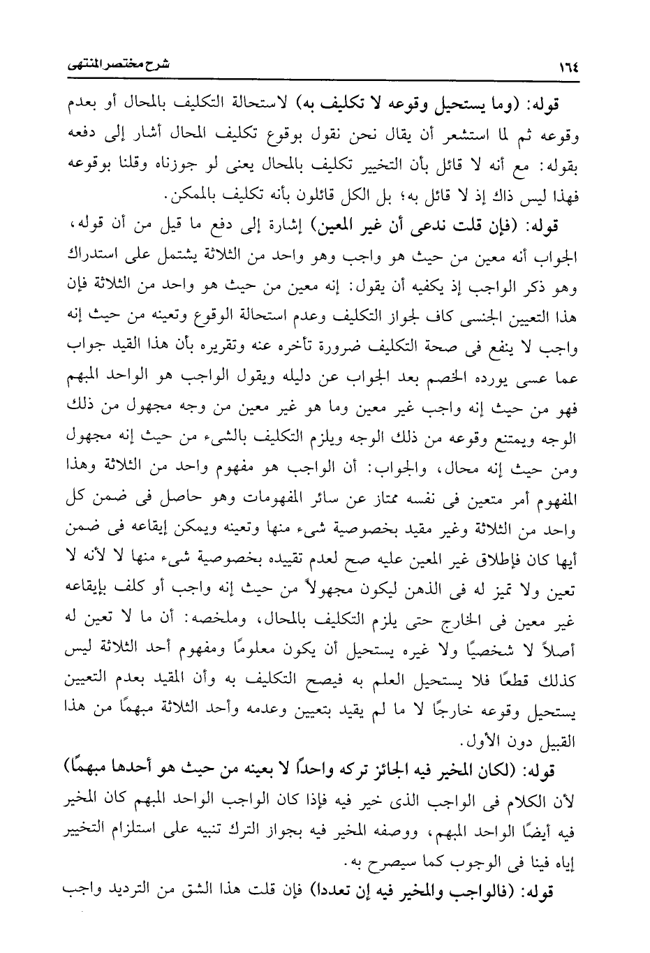 قوله: (فإن قلت ندعى أن غير العين) إشارة إلى دفع ما قيل من أن قوله، الجواب أنه معين من حيث هو واجب وهو واحد من الثلاثة يشتمل على استدراك وهو ذكر الواجب إذ يكفيه أن يقول: إنه معين من حيث هو واحد من الثلاثة فإن هذا التعيين الجنسى كاف لجواز التكليف وعدم استحالة الوقوع وتعينه من حيث إنه واجب لا ينفع فى صحة التكليف ضرورة تأخره عنه وتقريره بأن هذا القيد جواب عما عسى يورده الخصم بعد الجواب عن دليله ويقول الواجب هو الواحد المبهم فهو من حيث إنه واجب غير معين وما هو غير معين من وجه مجهول من ذلك الوجه ويمتنع وقوعه من ذلك الوجه ويلزم التكليف بالشئ من حيث إنه مجهول ومن حيث إنه محال، والجواب: أن الواجب هو مفهوم واحد من الثلاثة وهذا المفهوم أمر متعين فى نفسه ممتاز عن سائر المفهومات وهو حاصل فى ضمن كل واحد من الثلاثة وغير مقيد بخصوصية شئ منها وتعينه ويمكن إيقاعه فى ضمن أيها كان فإطلاق غير المعين عليه صح لعدم تقييده بخصوصية شئ منها لا لأنه لا تعين ولا يتميز له فى الذهن ليكون مجهولًا من حيث إنه واجب أو كلف بإيقاعه غير معين فى الخارج حتى يلزم التكليف بالمحال، وملخصه: أن ما لا تعين له أصلًا لا شخصيًا ولا غيره يستحيل أن يكون معلومًا ومفهوم أحد الثلاثة ليس كذلك قطعًا فلا يستحيل العلم به فيصح التكليف به وأن المقيد بعدم التعيين يستحيل وقوعه خارجًا لا ما لم يقيد بتعيين وعدمه وأحد الثلاثة مبهمًا من هذا القبيل دون الأول.