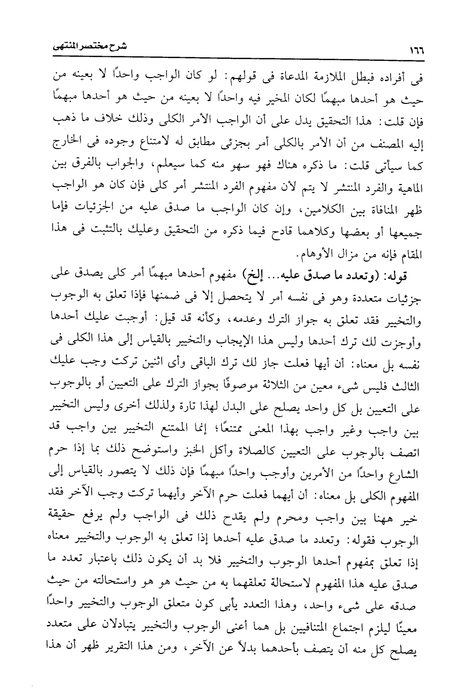 فى أفراده فبطل الملازمة الدعاة فى قولهم: لو كان الواجب واحدًا لا بعينه من حيث هو أحدها مبهمًا لكان الخير فيه واحدًا لا بعينه من حيث هو أحدها مبهمًا فإن قلت: هذا التحقيق يدل على أن الواجب الأمر الكلى وذلك خلاف ما ذهب إليه المصنف من أن الأمر بالكلى أمر بجزئى مطابق له لامتناع وجوده فى الخارج كما سيأتى قلت: ما ذكره هناك فهو سهو منه كما سيعلم، والجواب بالفرق بين الماهية والفرد المنتشر لا يتم لأن مفهوم الفرد المنتشر أمر على فإن كان هو الواجب ظهر المنافاة بين الكلامين، وإن كان الواجب ما صدق عليه من الجزئيات فإما جميعها أو بعضها وكلاهما قادح فيما ذكره من التحقيق وعليك بالتثبت فى هذا المقام فإنه من مزال الأوهام.