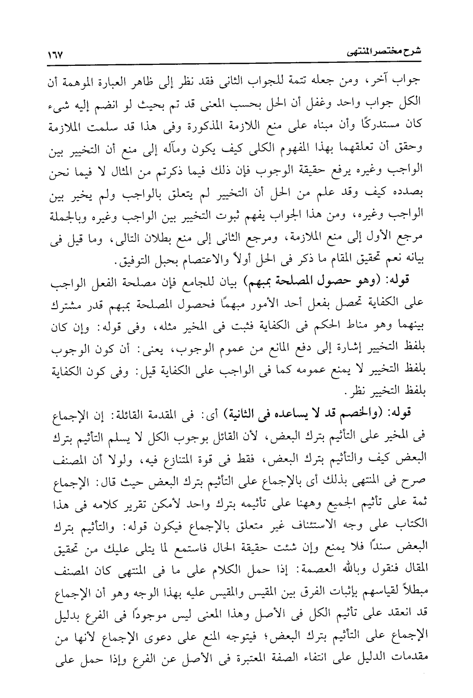 جواب آخر، ومن جعله تتمة للجواب الثانى فقد نظر إلى ظاهر العبارة الموهمة أن الكل جواب واحد وغفل أن الحل بحسب المعنى قد تم بحيث لو انضم إليه شئ كان مستدركًا وأن مبناه على منع اللازمة المذكورة وفى هذا قد سلمت الملازمة وحقق أن تعلقهما بهذا المفهوم الكلى كيف يكون ومآله إلى منع أن التخيير بين الواجب وغيره يرفع حقيقة الوجوب فإن ذلك فيما ذكرتم من المثال لا فيما نحن بصدده كيف وقد علم من الحل أن التخيير لم يتعلق بالواجب ولم يخير بين الواجب وغيره، ومن هذا الجواب يفهم ثبوت التخيير بين الواجب وغيره وبالجملة مرجع الأول إلى منع الملازمة، ومرجع الثانى إلى منع بطلان التالى، وما قيل فى بيانه نعم تحقيق المقام ما ذكر فى الحل أولًا والاعتصام بحبل التوفيق.