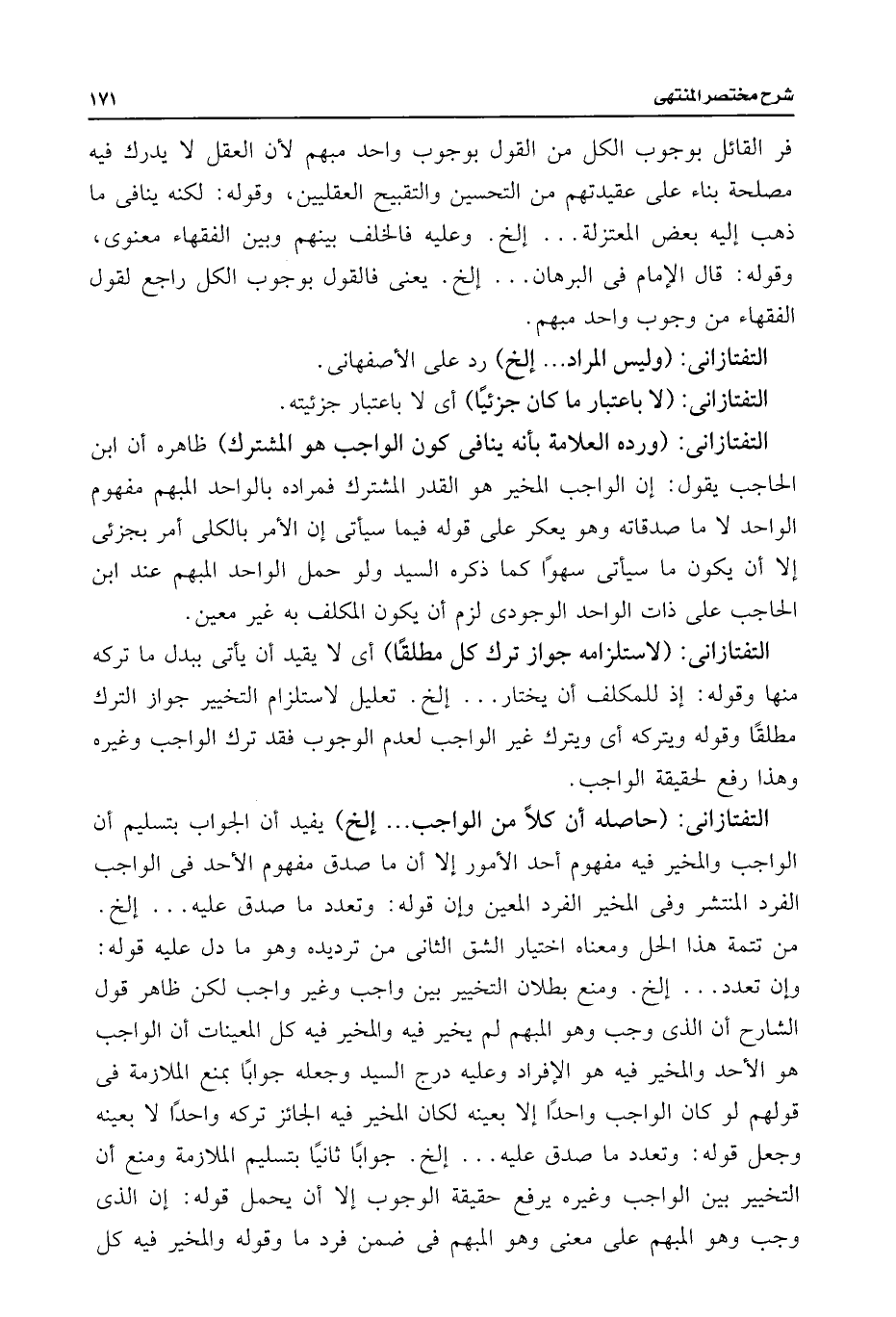 التفتازانى: (ورده العلامة بأنه ينافى كون الواجب هو المشترك) ظاهره أن ابن الحاجب يقول: إن الواجب المخير هو القدر المشترك فمراده بالواحد المبهم مفهوم الواحد لا ما صدقاته وهو يعكر على قوله فيما سيأتى إن الأمر بالكلى أمر بجزئى إلا أن يكون ما سيأتى سهوًا كما ذكره السيد ولو حمل الواحد المبهم عند ابن الحاجب على ذات الواحد الوجودى لزم أن يكون المكلف به غير معين.