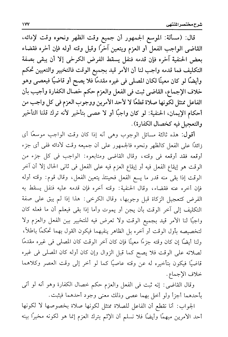 قال: (مسألة: الموسع الجمهور أن جميع وقت الظهر ونحوه وقت لإدائه، القاضى الواجب الفعل أو العزم ويتعين آخرًا وقيل وقته أوله فإن آخره فقضاء بعض الحنفية آخره فإن قدمه فنفل يسقط الفرض الكرخى إلا أن يبقى بصفة التكليف فما قدمه واجب لنا أن الأمر قيد بجميع الوقت فالتخيير والتعيين تحكم وأيضًا لو كان معينًا لكان المصلى فى غيره مقدمًا فلا يصح أو قاضيًا فيعصى وهو خلاف الإجماع، القاضى ثبت فى الفعل والعزم حكم خصال الكفارة وأجيب بأن الفاعل ممتثل لكونها صلاة قطعًا لا لأحد الأمرين ووجوب العزم فى كل واجب من أحكام الإيمان, الحنفية: لو كان واجبًا أو لا عصى بتأخير لأنه ترك قلنا التأخير والتعجيل فيه كخصال الكفارة).