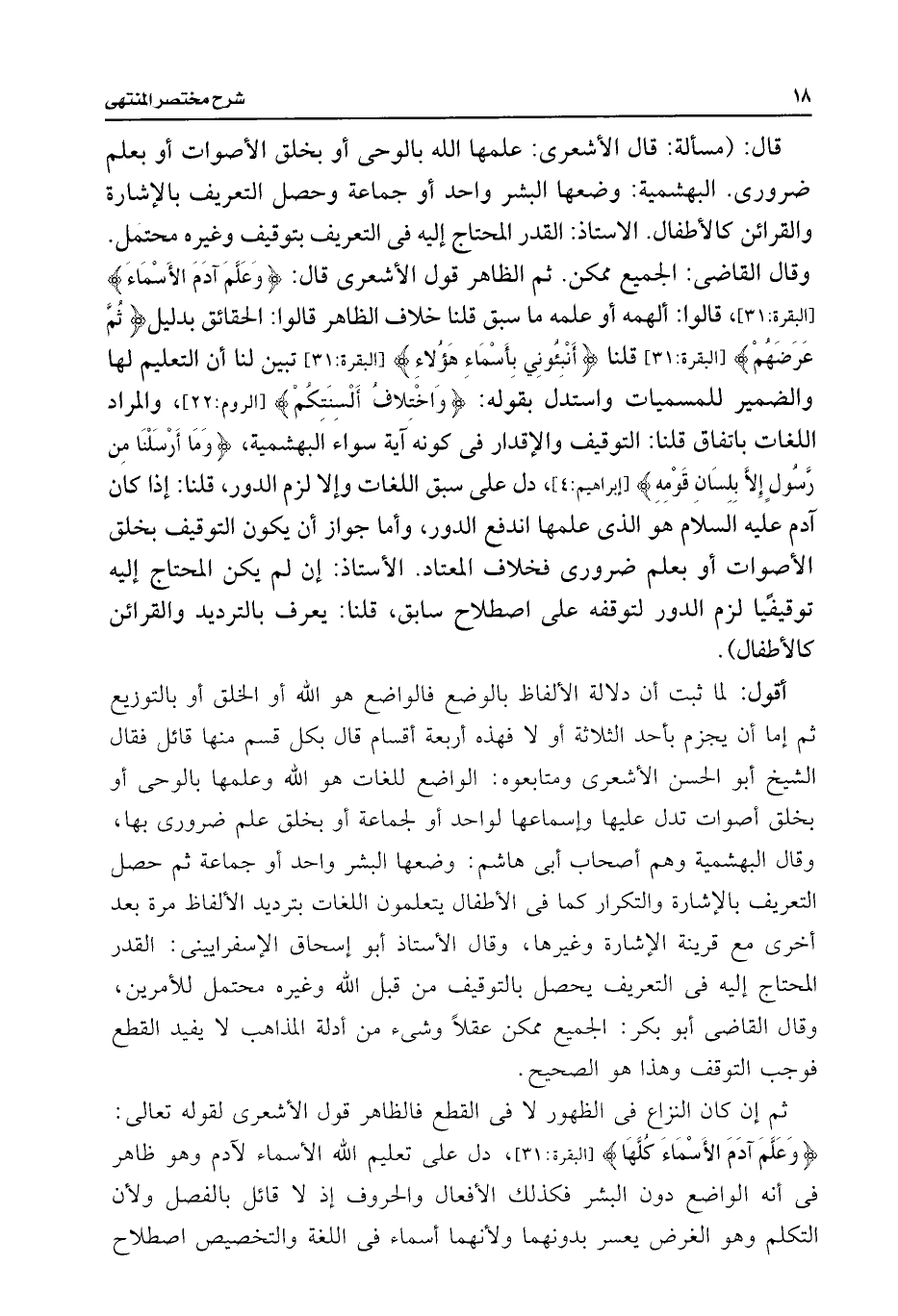 قال: (مسألة: قال الأشعرى: علمها اللَّه بالوحى أو بخلق الأصوات أو بعلم ضرورى. البهشمية: وضعها البشر واحد أو جماعة وحصل التعريف بالإشارة والقرائن كالأطفال. الاستاذ: القدر المحتاج إليه فى التعريف بتوقيف وغيره محتمل. وقال القاضى: الجميع ممكن. ثم الظاهر قول الأشعرى قال: {وَعَلَّمَ آدمَ الأَسْمَاءَ} [البقرة: ٣١]، قالوا: ألهمه أو علمه ما سبق قلنا خلاف الظاهر قالوا: الحقائق بدليل {ثُمَّ عَرَضَهُمْ} [البقرة: ٣١] قلنا {انْبِئُونِي بِأَسْمَاء هَؤُلَاءِ} [البقرة: ٣١] تبين لنا أى التعليم لها والضمير للمسميات واستدل بقوله: {وَاخْتِلافُ أَلْسِنَتِكُمْ} [الروم: ٢٢]، والمراد اللغات باتفاق قلنا: التوقيف والإقدار فى كونه آية سواء البهشمية، {وَمَا أَرْسَلْنَا مِنْ رَّسُولٍ إِلَّا بِلِسَانِ قَوْمِهِ} [إبراهيم: ٤]، دل على سبق اللغات وإلا لزم الدور، قلنا: إذا كان آدم عليه السلام هو الذى علمها اندفع الدور، وأما جواز أن يكون التوقيف بخلق الأصوات أو بعلم ضرورى فخلاف المعتاد. الأستاذ: إن لم يكن المحتاج إليه توقيفيًا لزم الدور لتوقفه على اصطلاح سابق، قلنا: يعرف بالترديد والقرائن كالأطفال).