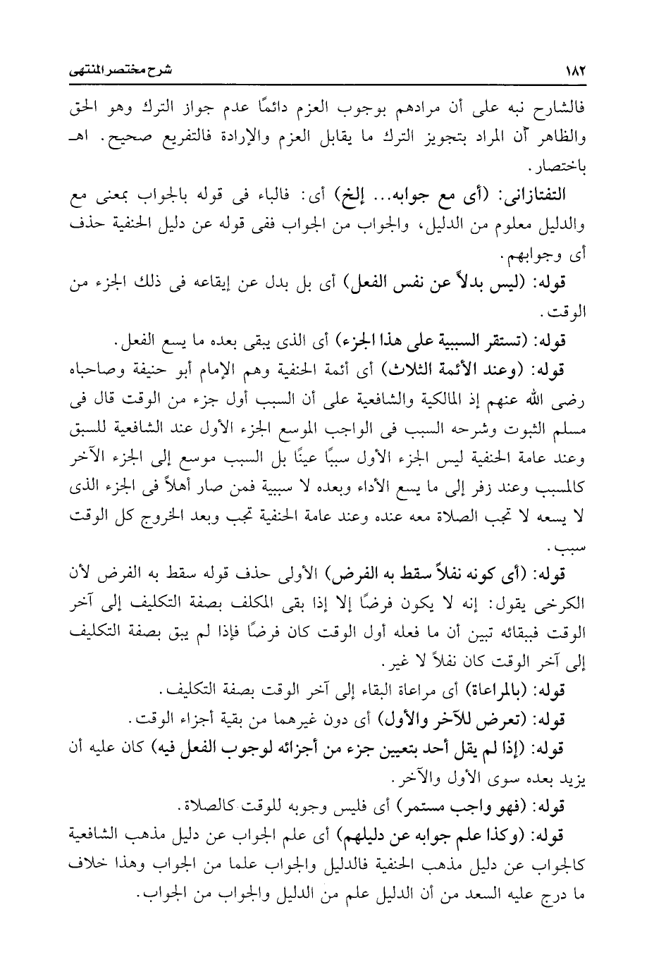 التفتازانى: (أى مع جوابه. . . إلخ) أى: فالباء فى قوله بالجواب بمعنى مع والدليل معلوم من الدليل، والجواب من الجواب ففى قوله عن دليل الحنفية حذف أى وجوابهم.