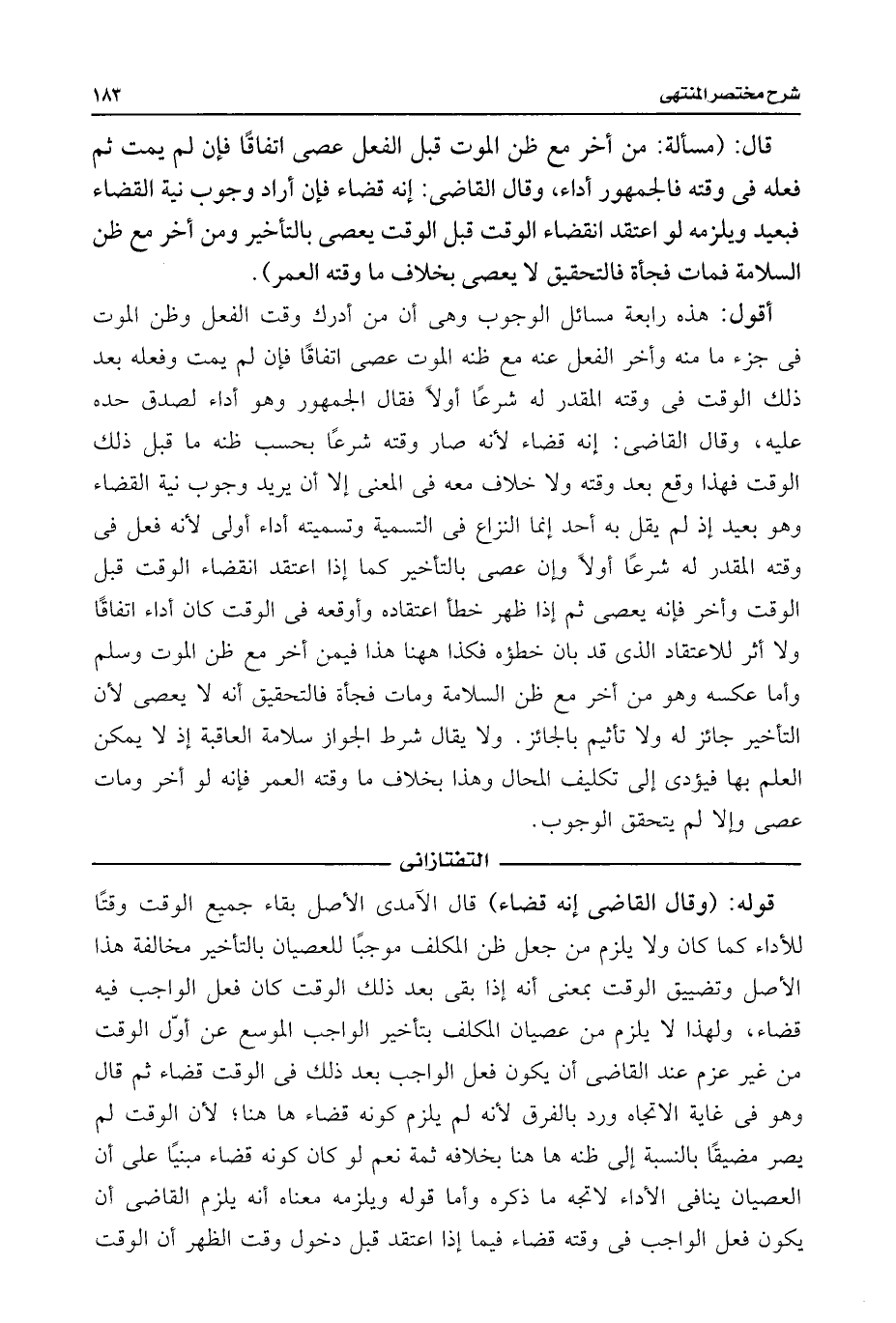 أقول: هذه رابعة مسائل الوجوب وهى أن من أدرك وقت الفعل وظن الموت فى جزء ما منه وأخر الفعل عنه مع ظنه الموت عصى اتفاقًا فإن لم يمت وفعله بعد ذلك الوقت فى وقته المقدر له شرعًا أولًا فقال الجمهور وهو أداء لصدق حده عليه، وقال القاضى: إنه قضاء لأنه صار وقته شرعًا بحسب ظنه ما قبل ذلك الوقت فهذا وقع بعد وقته ولا خلاف معه فى المعنى إلا أن يريد وجوب نية القضاء وهو بعيد إذ لم يقل به أحد إنما النزاع فى التسمية وتسميته أداء أولى لأنه فعل فى وقته المقدر له شرعًا أولًا وإن عصى بالتأخير كما إذا اعتقد انقضاء الوقت قبل الوقت وأخر فإنه يعصى ثم إذا ظهر خطأ اعتقاده وأوقعه فى الوقت كان أداء اتفاقًا ولا أثر للاعتقاد الذى قد بأن خطؤه فكذا ههنا هذا فيمن أخر مع ظن الموت وسلم وأما عكسه وهو من أخر مع ظن السلامة ومات فجأة فالتحقيق أنه لا يعصى لأن التأخير جائز له ولا تأثيم بالجائز. ولا يقال شرط الجواز سلامة العاقبة إذ لا يمكن العلم بها فيؤدى إلى تكليف المحال وهذا بخلاف ما وقته العمر فإنه لو أخر ومات عصى وإلا لم يتحقق الوجوب.