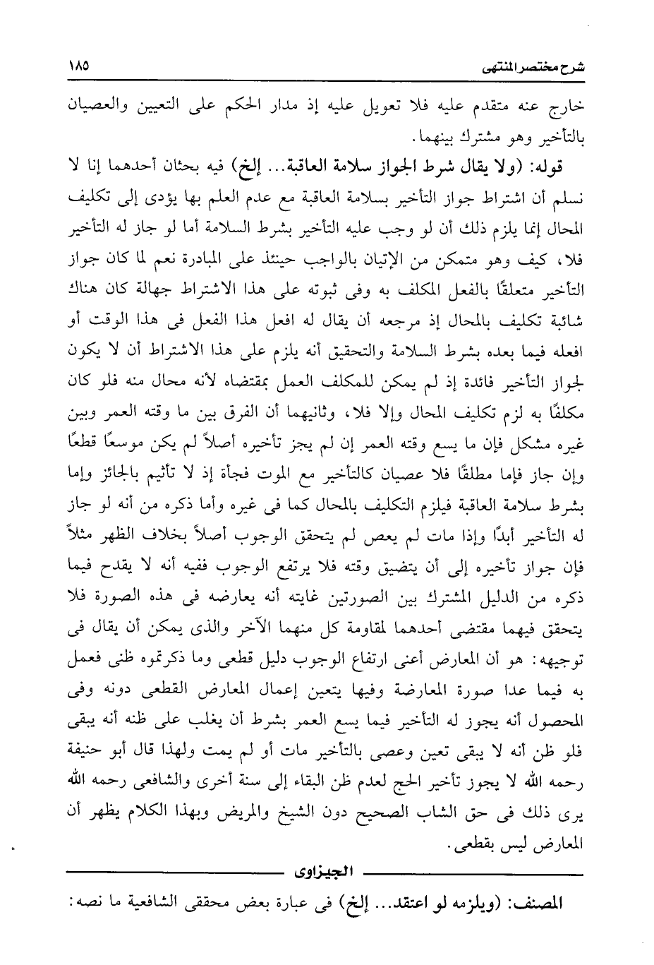 قوله: (ولا يقال شرط الجواز سلامة العاقبة. . . إلخ) فيه بحثان أحدهما إنا لا نسلم أن اشتراط جواز التأخير بسلامة العاقبة مع عدم العلم بها يؤدى إلى تكليف الحال إنما يلزم ذلك أن لو وجب عليه التأخير بشرط السلامة أما لو جاز له التأخير فلا، كيف وهو متمكن من الإتيان بالواجب حينئذ على المبادرة نعم لما كان جواز التأخير متعلقًا بالفعل الكلف به وفى ثبوته على هذا الاشتراط جهالة كان هناك شائبة تكليف بالمحال إذ مرجعه أن يقال له افعل هذا الفعل فى هذا الوقت أو افعله فيما بعده بشرط السلامة والتحقيق أنه يلزم على هذا الاشتراط أن لا يكون لجواز التأخير فائدة إذ لم يمكن للمكلف العمل بمقتضاه لأنه محال منه فلو كان مكلفًا به لزم تكليف المحال وإلا فلا، وثانيهما أن الفرق بين ما وقته العمر وبين غيره مشكل فإن ما يسع وقته العمر إن لم يجز تأخيره أصلًا لم يكن موسعًا قطعًا وإن جاز فإما مطلقًا فلا عصيان كالتأخير مع الموت فجأة إذ لا تأثيم بالجائز وإما بشرط سلامة العاقبة فيلزم التكليف بالمحال كما فى غيره وأما ذكره من أنه لو جاز له التأخير أبدًا وإذا مات لم يعص لم يتحقق الوجوب أصلًا بخلاف الظهر مثلًا فإن جواز تأخيره إلى أن يتضيق وقته فلا يرتفع الوجوب ففيه أنه لا يقدح فيما ذكره من الدليل المشترك بين الصورتين غايته أنه يعارضه فى هذه الصورة فلا يتحقق فيهما مقتضى أحدهما لمقاومة كل منهما الآخر والذى يمكن أن يقال فى توجيهه: هو أن المعارض أعنى ارتفاع الوجوب دليل قطعى وما ذكرتموه ظنى فعمل به فيما عدا صورة المعارضة وفيها يتعين إعمال المعارض القطعى دونه وفى المحصول أنه يجوز له التأخير فيما يسع العمر بشرط أن يغلب على ظنه أنه يبقى فلو ظن أنه لا يبقى تعين وعصى بالتأخير مات أو لم يمت ولهذا قال أبو حنيفة رحمه اللَّه لا يجوز تأخير الحج لعدم ظن البقاء إلى سنة أخرى والشافعى رحمه اللَّه يرى ذلك فى حق الشاب الصحيح دون الشيخ والمريض وبهذا الكلام يظهر أن المعارض ليس بقطعى.