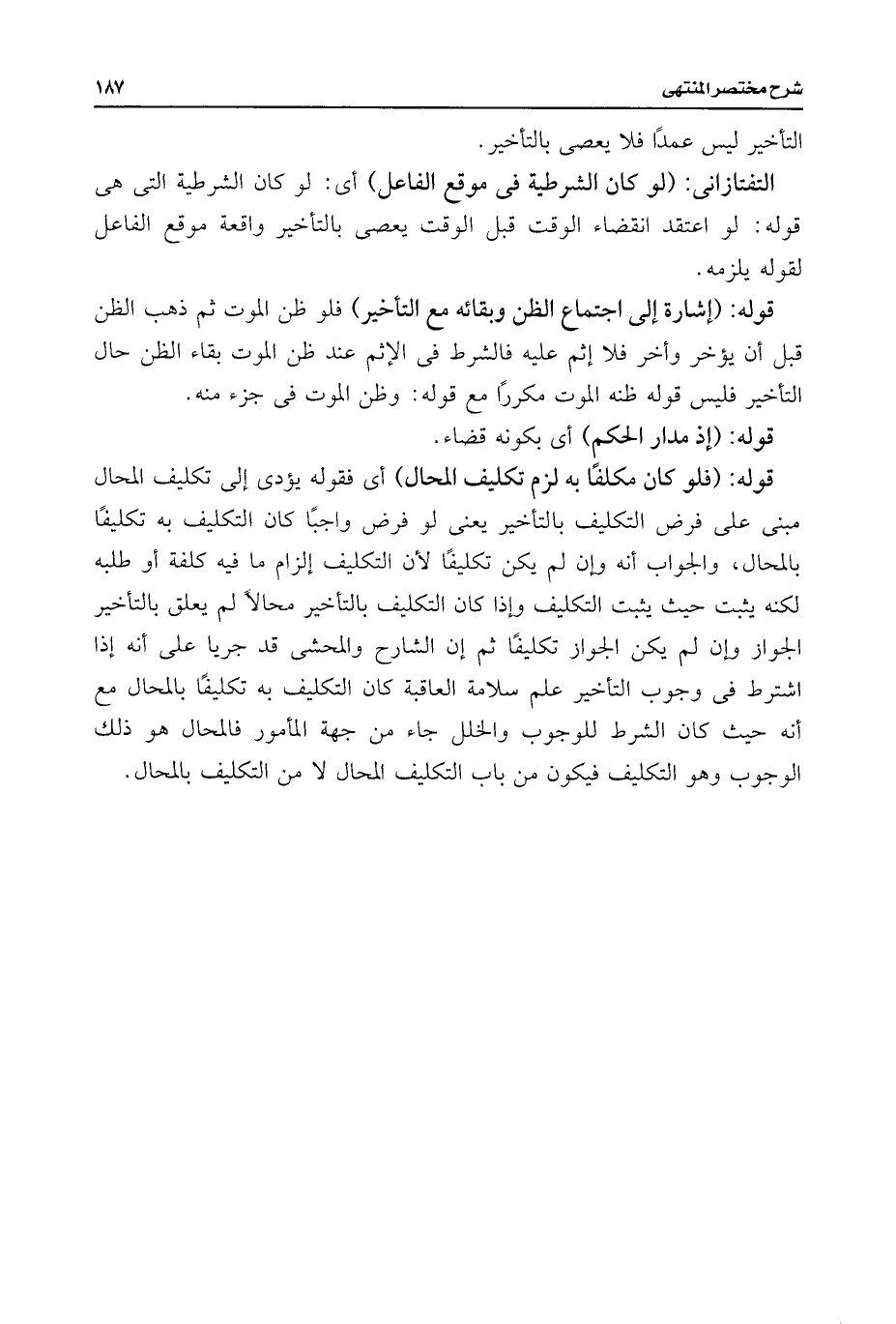 التفتازانى: (لو كان الشرطية فى موقع الفاعل) أى: لو كان الشرطية التى هى قوله: لو اعتقد إنقضاء الوقت قبل الوقت يعصى بالتأخير واقعة موقع الفاعل لقوله يلزمه.