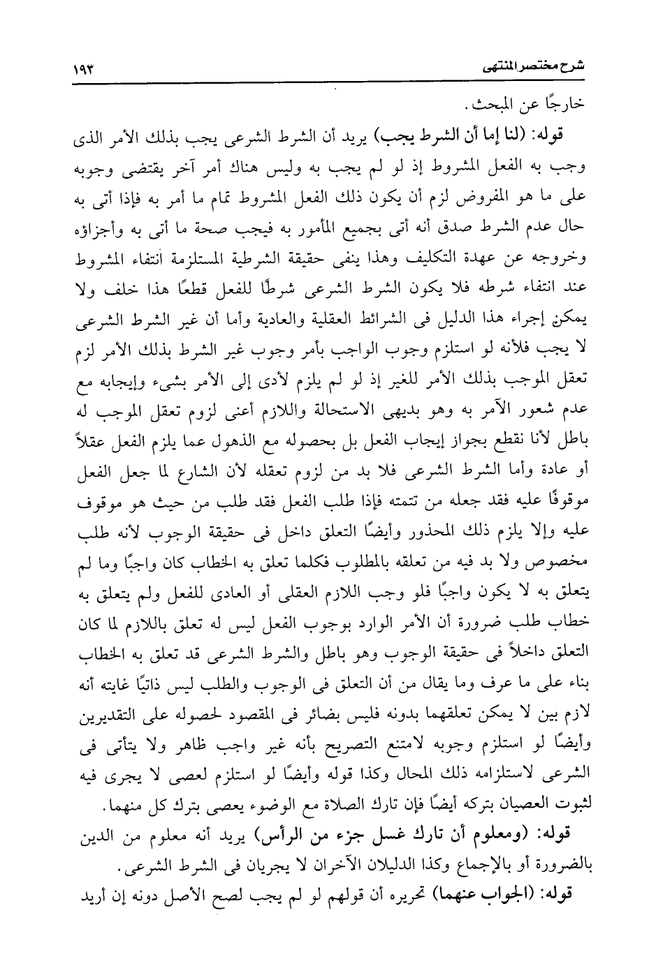قوله: (لنا إما أن الشرط يجب) يريد أن الشرط الشرعى يجب بذلك الأمر الذى وجب به الفعل المشروط إذ لو لم يجب به وليس هناك أمر آخر يقتضى وجوبه على ما هو المفروض لزم أن يكون ذلك الفعل المشروط تمام ما أمر به فإذا أتى به حال عدم الشرط صدق أنه أتى بجميع المأمور به فيجب صحة ما أتى به وأجزاؤه وخروجه عن عهدة التكليف وهذا ينفى حقيقة الشرطية المستلزمة انتفاء المشروط عند انتفاء شرطه فلا يكون الشرط الشرعى شرطًا للفعل قطعًا هذا خلف ولا يمكن إجراء هذا الدليل فى الشرائط العقلية والعادية وأما أن غير الشرط الشرعى لا يجب فلأنه لو استلزم وجوب الواجب بأمر وجوب غير الشرط بذلك الأمر لزم تعقل الموجب بذلك الأمر للغير إذ لو لم يلزم لأدى إلى الأمر بشئ وإيجابه مع عدم شعور الآمر به وهو بديهى الاستحالة واللازم أعنى لزوم تعقل الموجب له باطل لأنا نقطع بجواز إيجاب الفعل بل بحصوله مع الذهول عما يلزم الفعل عقلًا أو عادة وأما الشرط الشرعى فلا بد من لزوم تعقله لأن الشارع لما جعل الفعل موقوفًا عليه فقد جعله من تتمته فإذا طلب الفعل فقد طلب من حيث هو موقوف عليه وإلا يلزم ذلك المحذور وأيضًا التعلق داخل فى حقيقة الوجوب لأنه طلب مخصوص ولا بد فيه من تعلقه بالمطلوب فكلما تعلق به الخطاب كان واجبًا وما لم يتعلق به لا يكون واجبًا فلو وجب اللازم العقلى أو العادى للفعل ولم يتعلق به خطاب طلب ضرورة أن الأمر الوارد بوجوب الفعل ليس له تعلق باللازم لما كان التعلق داخلًا فى حقيقة الوجوب وهو باطل والشرط الشرعى قد تعلق به الخطاب بناء على ما عرف وما يقال من أن التعلق فى الوجوب والطلب ليس ذاتيًا غايته أنه لازم بين لا يمكن تعلقهما بدونه فليس بضائر فى المقصود لحصوله على التقديرين وأيضًا لو استلزم وجوبه لامتنع التصريح بأنه غير واجب ظاهر ولا يتأتى فى الشرعى لاستلزامه ذلك المحال وكذا قوله وأيضًا لو استلزم لعصى لا يجرى فيه لثبوت العصيان بتركه أيضًا فإن تارك الصلاة مع الوضوء يعصى بترك كل منهما.
