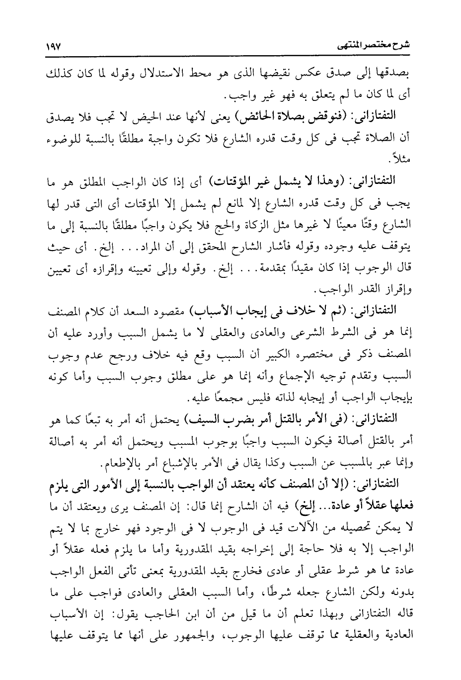 التفتازانى: (وهذا لا يشمل غير المؤقتات) أى إذا كان الواجب المطلق هو ما يجب فى كل وقت قدره الشارع إلا لمانع لم يشمل إلا المؤقتات أى التى قدر لها الشارع وقتًا معينًا لا غيرها مثل الزكاة والحج فلا يكون واجبًا مطلقًا بالنسبة إلى ما يتوقف عليه وجوده وقوله فأشار الشارح المحقق إلى أن المراد. . . إلخ. أى حيث قال الوجوب إذا كان مقيدًا بمقدمة. . . إلخ. وقوله وإلى تعيينه وإقرازه أى تعيين وإقراز القدر الواجب.