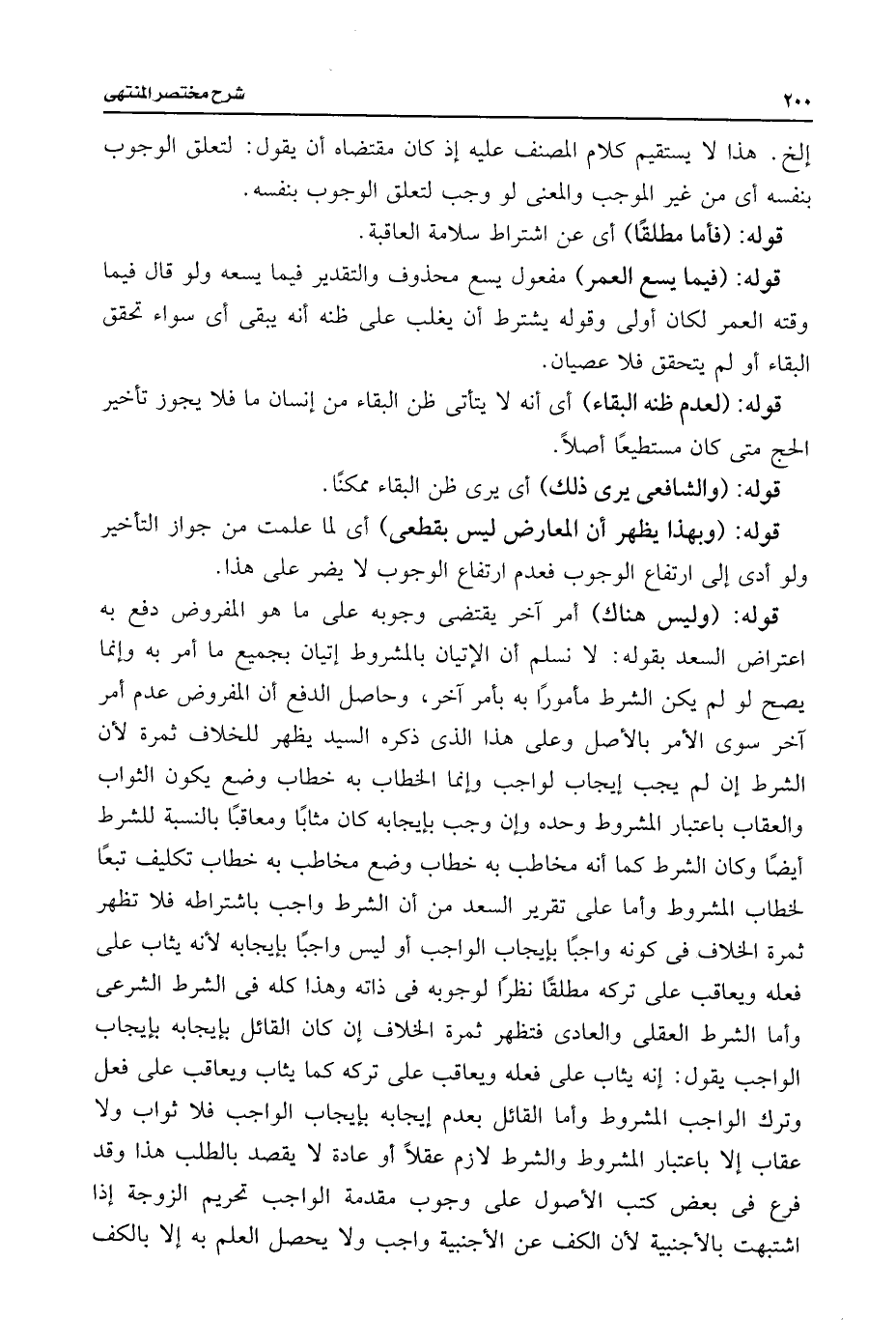 قوله: (وليس هناك) أمر آخر يقتضى وجوبه على ما هو المفروض دفع به اعتراض السعد بقوله: لا نسلم أن الإتيان بالمشروط إتيان بجميع ما أمر به وإنما يصح لو لم يكن الشرط مأمورًا به بأمر آخر، وحاصل الدفع أن المفروض عدم أمر آخر سوى الأمر بالأصل وعلى هذا الذى ذكره السيد يظهر للخلاف ثمرة لأن الشرط إن لم يجب إيجاب لواجب وإنما الخطاب به خطاب وضع يكون الثواب والعقاب باعتبار المشروط وحده وإن وجب بإيجابه كان مثابًا ومعاقبًا بالنسبة للشرط أيضًا وكان الشرط كما أنه مخاطب به خطاب وضع مخاطب به خطاب تكليف تبعًا لخطاب المشروط وأما على تقرير السعد من أن الشرط واجب باشتراطه فلا تظهر ثمرة الخلاف فى كونه واجبًا بإيجاب الواجب أو ليس واجبًا بإيجابه لأنه يثاب على فعله ويعاقب على تركه مطلقًا نظرًا لوجوبه فى ذاته وهذا كله فى الشرط الشرعى وأما الشرط العقلى والعادى فتظهر ثمرة الخلاف إن كان القائل بإيجابه بإيجاب الواجب يقول: إنه يثاب على فعله ويعاقب على تركه كما يثاب ويعاقب على فعل وترك الواجب المشروط وأما القائل بعدم إيجابه بإيجاب الواجب فلا ثواب ولا عقاب إلا باعتبار المشروط والشرط لازم عقلًا أو عادة لا يقصد بالطلب هذا وقد فرع فى بعض كتب الأصول على وجوب مقدمة الواجب تحريم الزوجة إذا اشتبهت بالأجنبية لأن الكف عن الأجنبية واجب ولا يحصل العلم به إلا بالكف