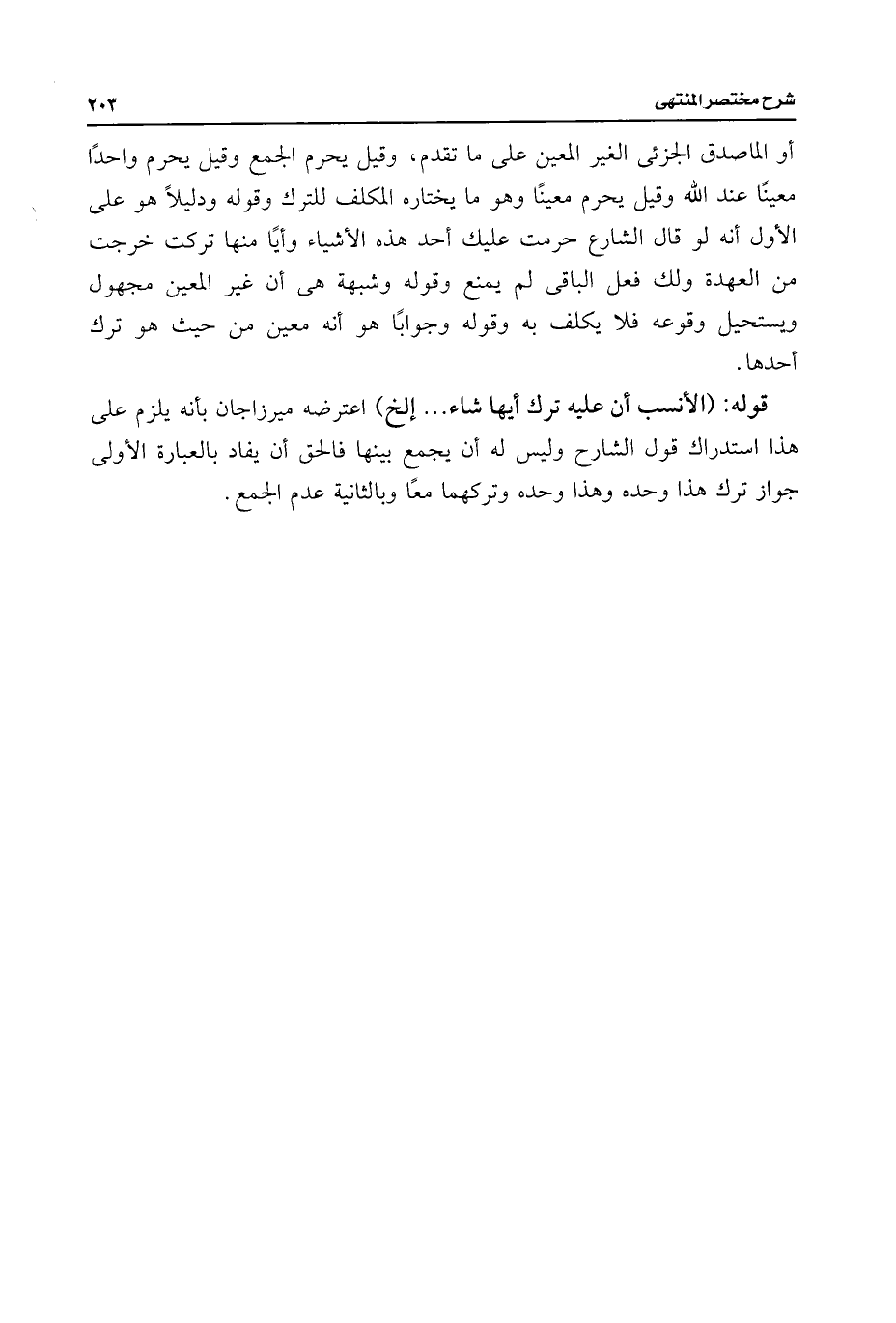 أو الماصدق الجزئى الغير المعين على ما تقدم، وقيل يحرم الجمع وقيل يحرم واحدًا معينًا عند اللَّه وقيل يحرم معينًا وهو ما يختاره المكلف للترك وقوله ودليلًا هو على الأول أنه لو قال الشارع حرمت عليك أحد هذه الأشياء وأيًا منها تركت خرجت من العهدة ولك فعل الباقى لم يمنع وقوله وشبهة هى أن غير المعين مجهول ويستحيل وقوعه فلا يكلف به وقوله وجوابًا هو أنه معين من حيث هو ترك أحدها.