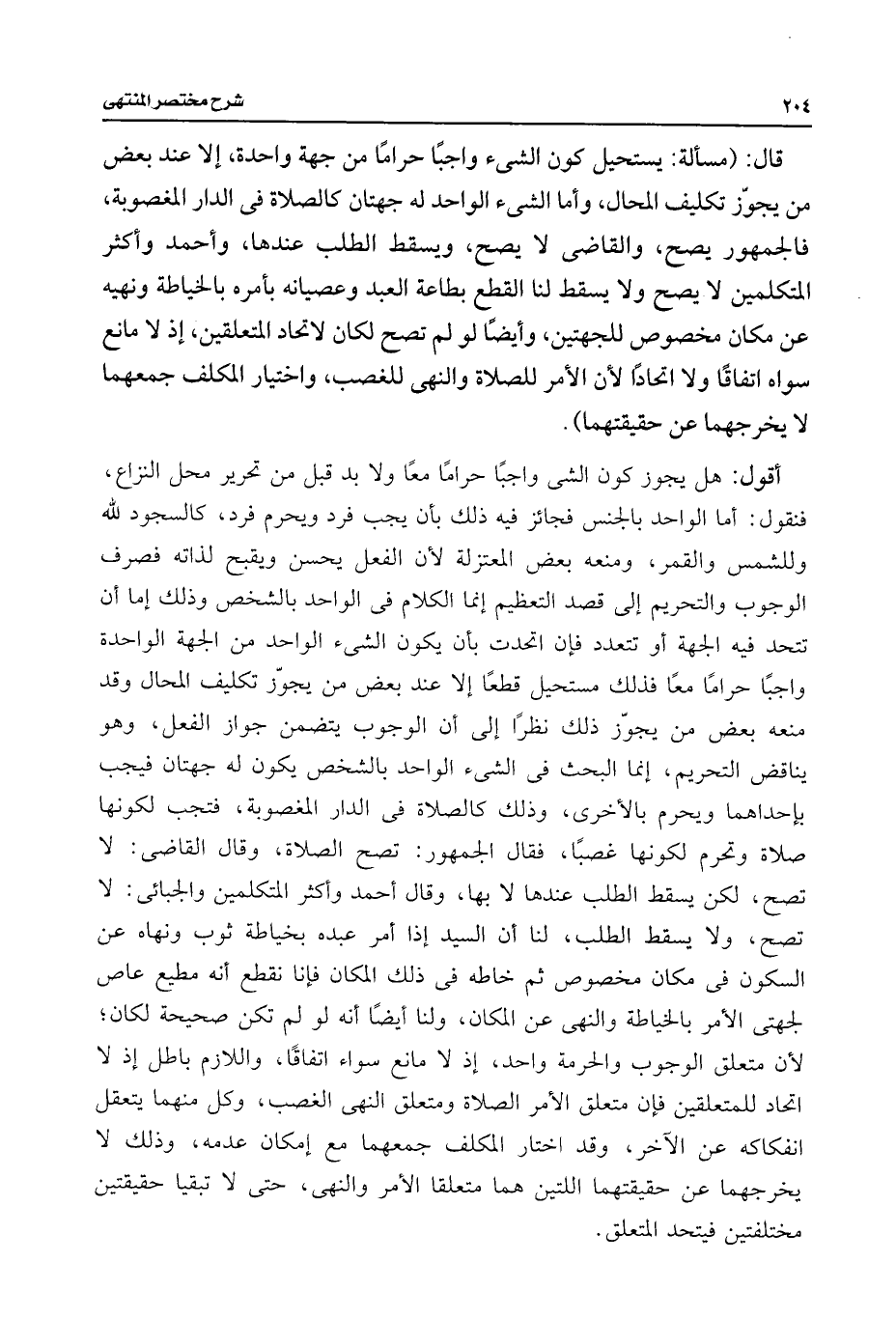 أقول: هل يجوز كون الشى واجبًا حرامًا معًا ولا بد قبل من متحرير محل النزاع، فنقول: أما الواحد بالجنس فجائز فيه ذلك بأن يجب فرد ويحرم فرد، كالسجود للَّه وللشمس والقمر، ومنعه بعض المعتزلة لأن الفعل يحسن ويقبح لذاته فصرف الوجوب والتحريم إلى قصد التعظيم إنما الكلام فى الواحد بالشخص وذلك إما أن تتحد فيه الجهة أو تتعدد فإن اتحدت بأن يكون الشئ الواحد من الجهة الواحدة واجبًا حرامًا معًا فذلك مستحيل قطعًا إلا عند بعض من يجوّز تكليف المحال وقد منعه بعض من يجوّز ذلك نظرًا إلى أن الوجوب يتضمن جواز الفعل، وهو يناقض التحريم، إنما البحث فى الشئ الواحد بالشخص يكون له جهتان فيجب بإحداهما ويحرم بالأخرى، وذلك كالصلاة فى الدار المغصوبة، فتجب لكونها صلاة وتحرم لكونها غصبًا، فقال الجمهور: تصح الصلاة، وقال القاضى: لا تصح، لكن يسقط الطلب عندها لا بها، وقال أحمد وأكثر المتكلمين والجبائى: لا تصح، ولا يسقط الطلب، لنا أن السيد إذا أمر عبده بخياطة ثوب ونهاه عن السكون فى مكان مخصوص ثم خاطه فى ذلك المكان فإنا نقطع أنه مطيع عاص لجهتى الأمر بالخياطة والنهى عن المكان، ولنا أيضًا أنه لو لم تكن صحيحة لكان؛ لأن متعلق الوجوب والحرمة واحد، إذ لا مانع سواء اتفاقًا، واللازم باطل إذ لا اتحاد للمتعلقين فإن متعلق الأمر الصلاة ومتعلق النهى الغصب، وكل منهما يتعقل انفكاكه عن الآخر، وقد اختار المكلف جمعهما مع إمكان عدمه، وذلك لا يخرجهما عن حقيقتهما اللتين هما متعلقًا الأمر والنهى، حتى لا تبقيا حقيقتين مختلفتين فيتحد المتعلق.
