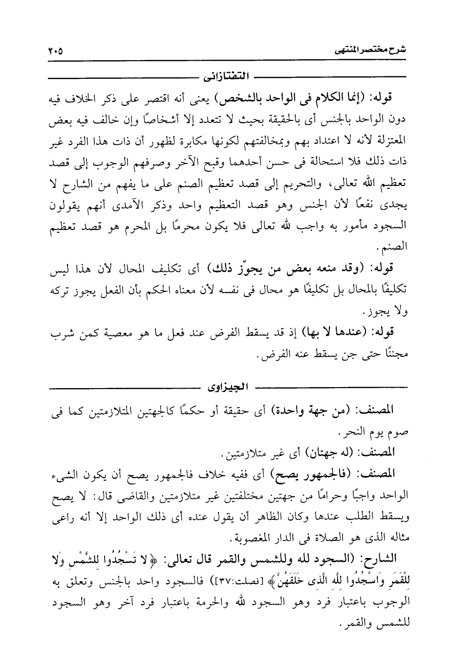 الشارح: (السجود للَّه وللشمس والقمر قال تعالى: {لَا تَسْجُدُوا لِلشَّمْسِ وَلَا لِلْقَمَرِ وَاسْجُدُوا لِلَّهِ الَّذِي خَلَقَهُنّ} [فصلت: ٣٧]) فالسجود واحد بالجنس وتعلق به الوجوب باعتبار فرد وهو السجود للَّه والحرمة باعتبار فرد آخر وهو السجود للشمس والقمر.