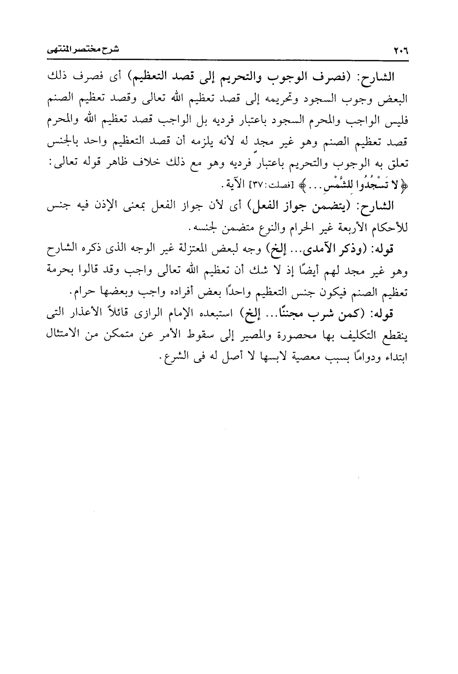 الشارح: (فصرف الوجوب والتحريم إلى قصد التعظيم) أى فصرف ذلك البعض وجوب السجود وتحريمه إلى قصد تعظيم اللَّه تعالى وقصد تعظيم الصنم فليس الواجب والمحرم السجود باعتبار فرديه بل الواجب قصد تعظيم اللَّه والمحرم قصد تعظيم الصنم وهو غير مجدٍ له لأنه يلزمه أن قصد التعظيم واحد بالجنس تعلق به الوجوب والتحريم باعتبار فرديه وهو مع ذلك خلاف ظاهر قوله تعالى: {لَا تَسْجُدُوا لِلشَّمْسِ. . .} [فصلت: ٣٧] الآية.