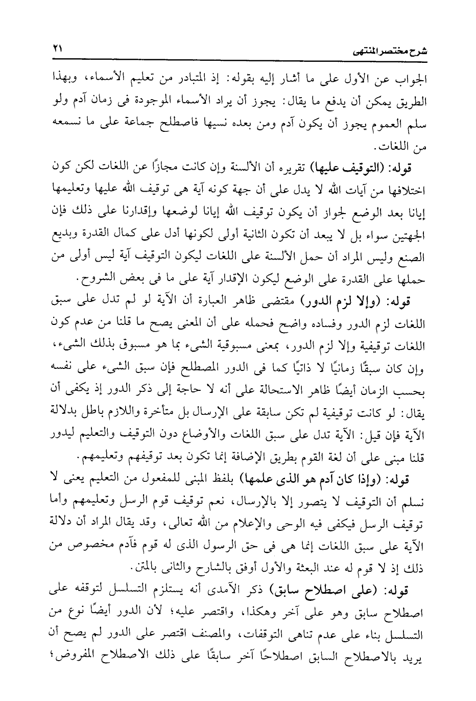 قوله: (وإذا كان آدم هو الذى علمها) بلفظ المبنى للمفعول من التعليم يعنى لا نسلم أن التوقيف لا يتصور إلا بالإرسال، نعم توقيف قوم الرسل وتعليمهم وأما توقيف الرسل فيكفى فيه الوحى والإعلام من اللَّه تعالى، وقد يقال المراد أن دلالة الآية على سبق اللغات إنما هى فى حق الرسول الذى له قوم فآدم مخصوص من ذلك إذ لا قوم له عند البعثة والأول أوفق بالشارح والثانى بالمتن.