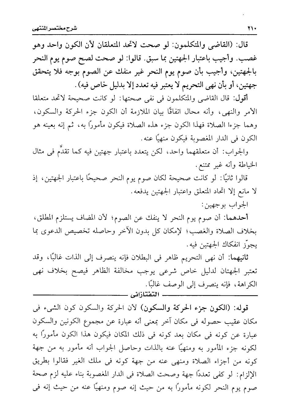قال: (القاضى والمتكلمون: لو صحت لاتحد المتعلقان لأن الكون واحد وهو غصب. وأجيب باعتبار الجهتين بما سبق. قالوا: لو صحت لصح صوم يوم النحر بالجهتين، وأجيب بأن صوم يوم النحر غير منفك عن الصوم بوجه فلا يتحقق جهتين، أو بأن نهى التحريم لا يعتبر فيه تعدد إلا بدليل خاص فيه).