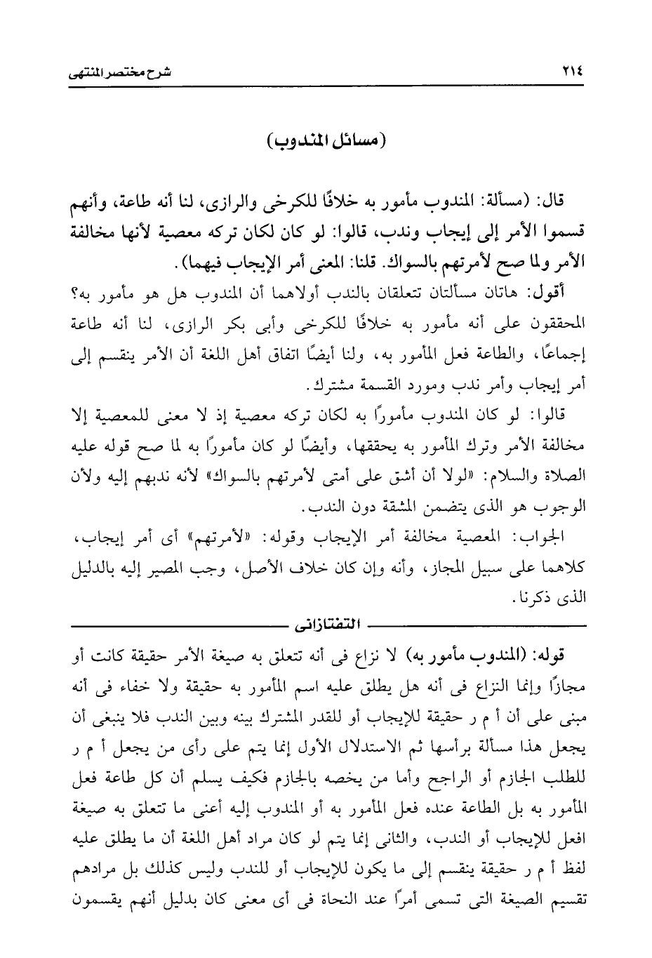 أقول: هاتان مسألتان تتعلقان بالندب أولاهما أن المندوب هل هو مأمور به؟ المحققون على أنه مأمور به خلافًا للكرخى وأبى بكر الرازى، لنا أنه طاعة إجماعًا، والطاعة فعل المأمور به، ولنا أيضًا اتفاق أهل اللغة أن الأمر ينقسم إلى أمر إيجاب وأمر ندب ومورد القسمة مشترك.