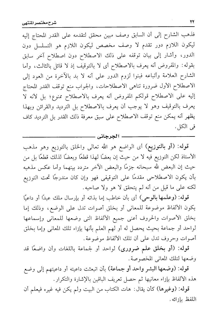 فذهب الشارح إلى أن السابق وصف مبين محقق لتقدمه على القدر المحتاج إليه ليكون اللازم دور تقدم لا وصف مخصص ليكون اللازم هو التسلسل دون الدور، وأشار إلى بيان توقفه على ذلك الاصطلاح دون اصطلاح آخر سابق بقوله: والمفروض أنه يعرف بالاصطلاح أى لا بالتوقيف إذ لا قائل بالثالث، وأما الشارح العلامة وأتباعه فبنوا لزوم الدور على أنه لا بد بالآخرة من العود إلى الاصطلاح الأول ضرورة تناهى الاصطلاحات، والجواب منع توقف القدر المحتاج إليه على الاصطلاح قولكم المفروض أنه يعرف بالاصطلاح ممنوع؛ بل لأنه لا يعرف بالتوقيف وهو لا يوجب أن يعرف بالاصطلاح بل الترديد والقرائن وبهذا يظهر أنه يمكن منع توقف الاصطلاح على سبق معرفة ذلك القدر بل الترديد كاف فى الكل.