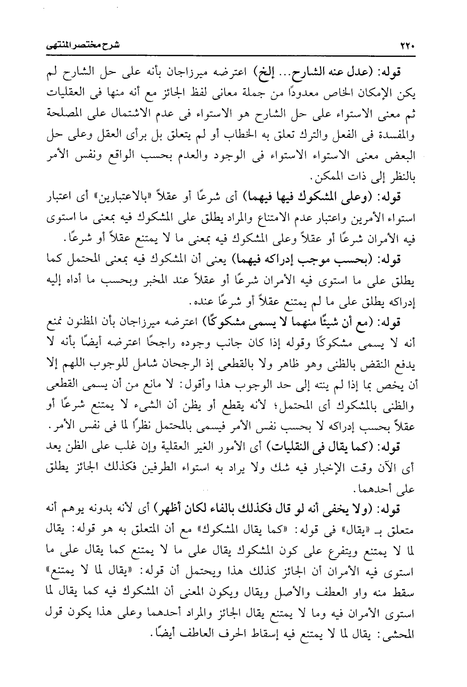قوله: (ولا يخفى أنه لو قال فكذلك بالنماء لكان أظهر) أى لأنه بدونه يوهم أنه متعلق بـ "يقال" فى قوله: "كما يقال المشكوك" مع أن المتعلق به هو قوله: يقال لما لا يمتنع ويتفرع على كون المشكوك يقال على ما لا يمتنع كما يقال على ما استوى فيه الأمران أن الجائز كذلك هذا ويحتمل أن قوله: "يقال لما لا يمتنع" سقط منه واو العطف والأكل ويقال ويكون المعنى أن المشكوك فيه كما يقال لما استوى الأمران فيه وما لا يمتنع يقال الجائز والمراد أحدهما وعلى هذا يكون قول المحشى: يقال لما لا يمتنع فيه إسقاط الحرف العاطف أيضًا.