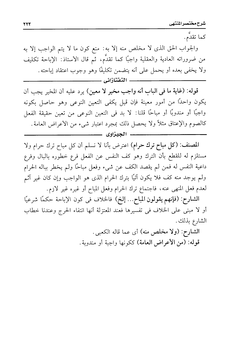 والجواب الحق الذى لا مخلص منه إلا به: منع كون ما لا يتم الواجب إلا به من ضروراته العادية والعقلية واجبًا كما تقدَّم، ثم قال الأستاذ: الإباحة تكليف ولا يخفى بعده أو يحمل على أنه يتضمن تكليفًا وهو وجوب اعتقاد إباحته.