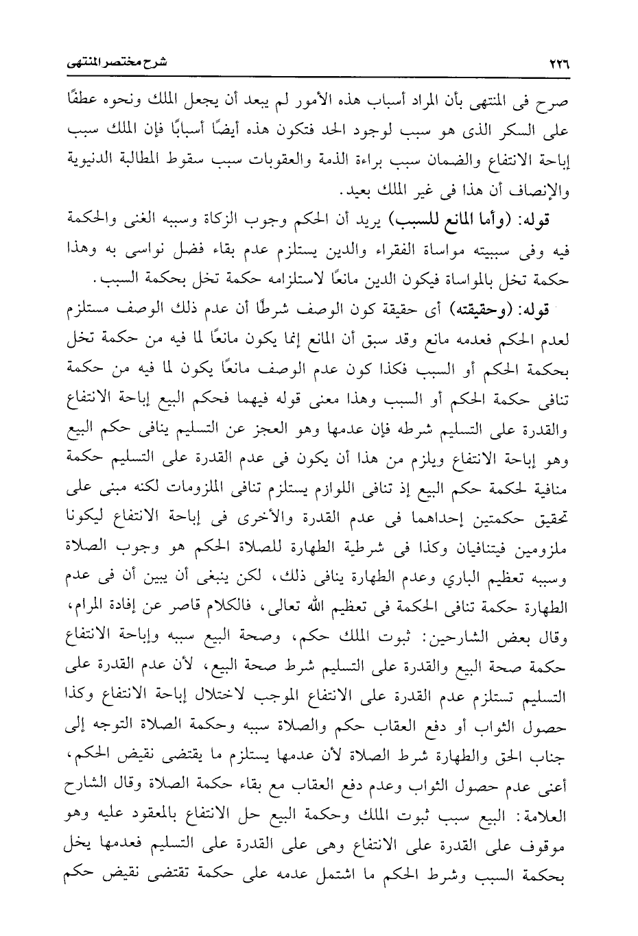 قوله: (وحقيقته) أى حقيقة كون الوصف شرطًا أن عدم ذلك الوصف مستلزم لعدم الحكم فعدمه مانع وقد سبق أن المانع إنما يكون مانعًا لما فيه من حكمة تخل بحكمة الحكم أو السبب فكذا كون عدم الوصف مانعًا يكون لما فيه من حكمة تنافى حكمة الحكم أو السبب وهذا معنى قوله فيهما فحكم البيع إباحة الانتفاع والقدرة على التسليم شرطه فإن عدمها وهو العجز عن التسليم ينافى حكم البيع وهو إباحة الانتفاع ويلزم من هذا أن يكون فى عدم القدرة على التسليم حكمة منافية لحكمة حكم البيع إذ تنافى اللوازم يستلزم تنافى الملزومات لكنه مبنى على تحقيق حكمتين إحداهما فى عدم القدرة والأخرى فى إباحة الانتفاع ليكونا ملزومين فيتنافيان وكذا فى شرطية الطهارة للصلاة الحكم هو وجوب الصلاة وسببه تعظيم البارى وعدم الطهارة ينافى ذلك، لكن ينبغى أن يبين أن فى عدم الطهارة حكمة تنافى الحكمة فى تعظيم اللَّه تعالى، فالكلام قاصر عن إفادة المرام، وقال بعض الشارحين: ثبوت الملك حكم، وصحة البيع سببه وإباحة الانتفاع حكمة صحة البيع والقدرة على التسليم شرط صحة البيع، لأن عدم القدرة على التسليم تستلزم عدم القدرة على الانتفاع الموجب لاختلال إباحة الانتفاع وهذا حصول الثواب أو دفع العقاب حكم والصلاة سببه وحكمة الصلاة التوجه إلى جناب الحق والطهارة شرط الصلاة لأن عدمها يستلزم ما يقتضى نقيض الحكم، أعنى عدم حصول الثواب وعدم دفع العقاب مع بقاء حكمة الصلاة وقال الشارح العلامة: البيع سبب ثبوت الملك وحكمة البيع حل الانتفاع بالمعقود عليه وهو موقوف على القدرة على الانتفاع وهى على القدرة على التسليم فعدمها يخل بحكمة السبب وشرط الحكم ما اشتمل عدمه على حكمة تقتضى نقيض حكم