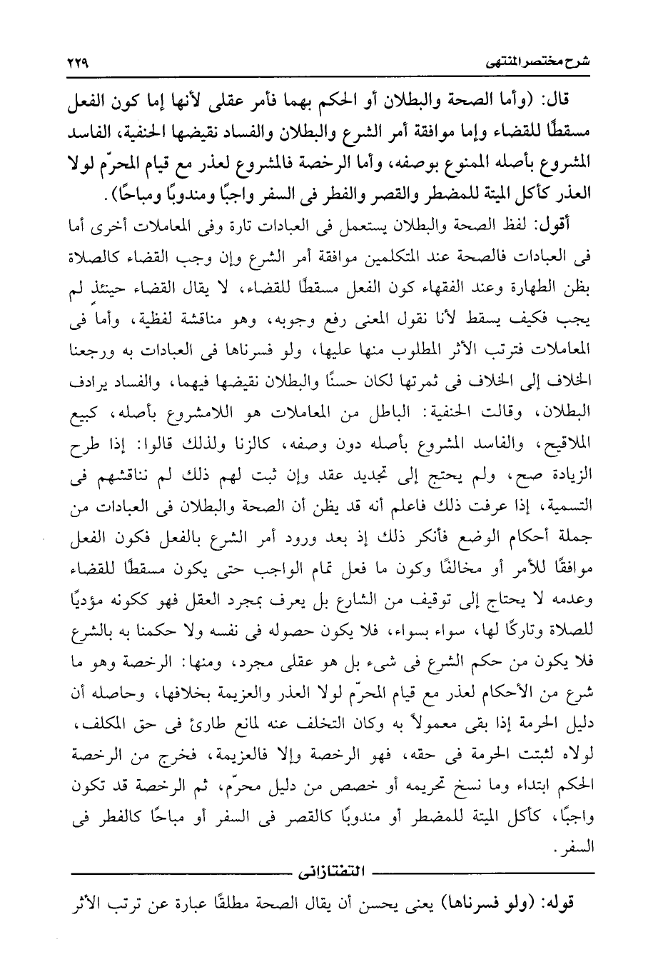 قال: (وأما الصحة والبطلان أو الحكم بهما فأمر عقلى لأنها إما كون الفعل مسقطًا للقضاء وإما موافقة أمر الشرع والبطلان والفساد نقيضها الحنفية، الفاسد المشروع بأصله الممنوع بوصفه، وأما الرخصة فالمشروع لعذر مع قيام المحرّم لولا العذر كأكل الميتة للمضطر والقصر والفطر فى السفر واجبًا ومندوبًا ومباحًا).