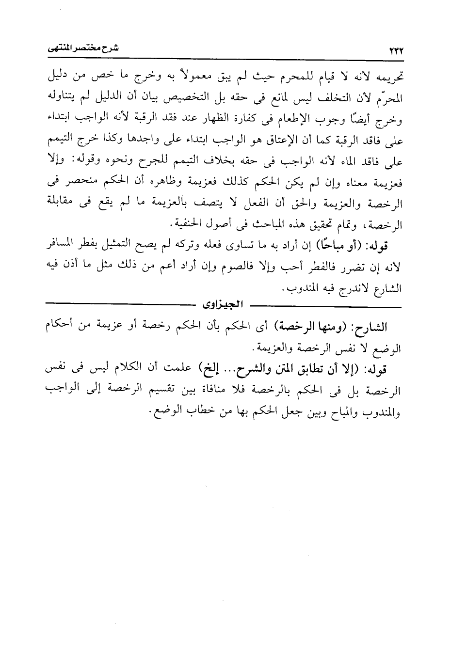 تحريمه لأنه لا قيام للمحرم حيث لم يبق معمولًا به وخرج ما خص من دليل المحرّم لأن التخلف ليس لمانع فى حقه بل التخصيص بيان أن الدليل لم يتناوله وخرج أيضًا وجوب الإطعام فى كفارة الظهار عند فقد الرقبة لأنه الواجب ابتداء على فاقد الرقبة كما أن الإعتاق هو الواجب ابتداء على واجدها وكذا خرج التيمم على فاقد الماء لأنه الواجب فى حقه بخلاف التيمم للجرح ونحوه وقوله: وإلا فعزيمة معناه وإن لم يكن الحكم كذلك فعزيمة وظاهره أن الحكم منحصر فى الرخصة والعزيمة والحق أن الفعل لا يتصف بالعزيمة ما لم يقع فى مقابلة الرخصة، وتمام تحقيق هذه المباحث فى أصول الحنفية.