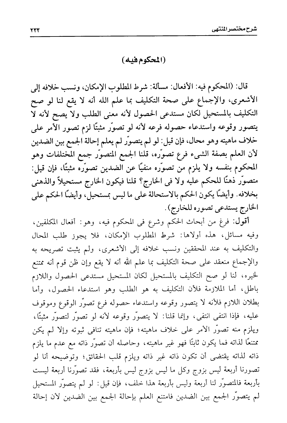 قال: (المحكوم فيه: الأفعال: مسألة: شرط المطلوب الإمكان، ونسب خلافه إلى الأشعرى، والإجماع على صحة التكليف بما علم اللَّه أنه لا يقع لنا لو صح التكليف بالمستحيل لكان مستدعى الحصول لأنه معنى الطلب ولا يصح لأنه لا يتصور وقوعه واستدعاء حصوله فرعه لأنه لو تصوّر مثبتًا لزم تصور الأمر على خلاف ماهيته وهو محال، فإن قيل: لو لم يتصوّر لم يعلم إحالة الجمع بين الضدين لأن العلم بصفة الشئ فرع تصوّره، قلنا الجمع المتصوّر جمع المختلفات وهو المحكوم بنفسه ولا يلزم من تصوّره منفيًا عن الضدين تصوّره مثبتًا، فإن قيل: متصوّر ذهنًا للحكم عليه ولا فى الخارج؟ قلنا فيكون الخارج مستحيلًا والذهنى بخلافه. وأيضًا يكون الحكم بالاستحالة على ما ليس بمستحيل، وأيضًا الحكم على الخارج يستدعى تصوره للخارج).
