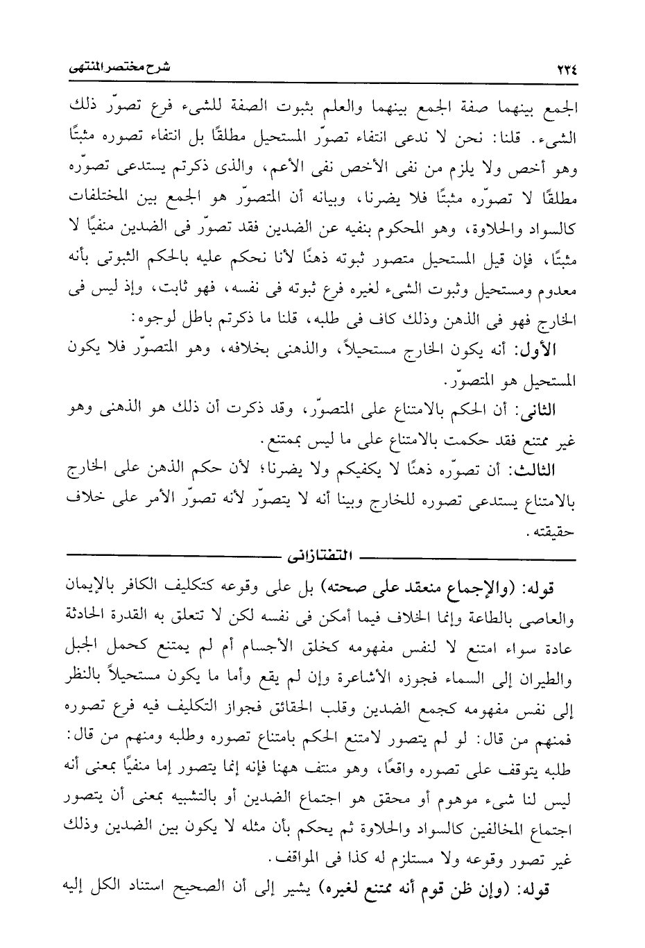 الجمع بينهما صفة الجمع بينهما والعلم بثبوت الصفة للشئ فرع تصوّر ذلك الشئ. قلنا: نحن لا ندعى انتفاء تصوّر المستحيل مطلقًا بل انتفاء تصوره مثبتًا وهو أخص ولا يلزم من نفى الأخص نفى الأعم، والذى ذكرتم يستدعى تصوّره مطلقًا لا تصوّره مثبتًا فلا يضرنا، وبيانه أن المتصوّر هو الجمع بين المختلفات كالسواد والحلاوة، وهو المحكوم بنفيه عن الضدين فقد تصوّر فى الضدين منفيًا لا مثبتًا، فإن قيل المستحيل متصور ثبوته ذهنًا لأنا نحكم عليه بالحكم الثبوتى بأنه معدوم ومستحيل وثبوت الشئ لغيره فرع ثبوته فى نفسه، فهو ثابت، وإذ ليس فى الخارج فهو فى الذهن وذلك كاف فى طلبه، قلنا ما ذكرتم باطل لوجوه: