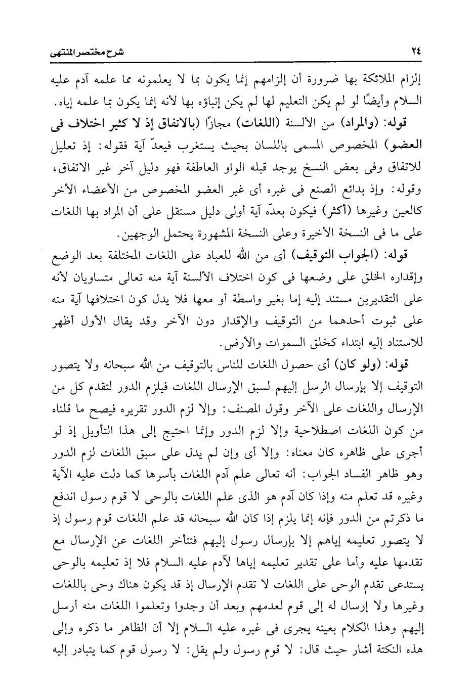 قوله: (ولو كان) أى حصول اللغات للناس بالتوقيف من اللَّه سبحانه ولا يتصور التوقيف إلا بإرسال الرسل إليهم لسبق الإرسال اللغات فيلزم الدور لتقدم كل من الإرسال واللغات على الآخر وقول المصنف: وإلا لزم الدور تقريره فيصح ما قلناه من كون اللغات اصطلاحية وإلا لزم الدور وإنما احتيج إلى هذا التأويل إذ لو أجرى على ظاهره كان معناه: وإلا أى وإن لم يدل على سبق اللغات لزم الدور وهو ظاهر الفساد الجواب: أنه تعالى علم آدم اللغات بأسرها كما دلت عليه الآية وغيره قد تعلم منه وإذا كان آدم هو الذى علم اللغات بالوحى لا قوم رسول اندفع ما ذكرتم من الدور فإنه إنما يلزم إذا كان اللَّه سبحانه قد علم اللغات قوم رسول إذ لا يتصور تعليمه إياهم إلا بإرسال رسول إليهم فتتأخر اللغات عن الإرسال مع تقدمها عليه وأما على تقدير تعليمه إياها لآدم عليه السلام فلا إذ تعليمه بالوحى يستدعى تقدم الوحى على اللغات لا تقدم الإرسال إذ قد يكون هناك وحى باللغات وغيرها ولا إرسال له إلى قوم لعدمهم وبعد أن وجدوا وتعلموا اللغات منه أرسل إليهم وهذا الكلام بعينه يجرى فى غيره عليه السلام إلا أن الظاهر ما ذكره وإلى هذه النكتة أشار حيث قال: لا قوم رسول ولم يقل: لا رسول قوم كما يتبادر إليه