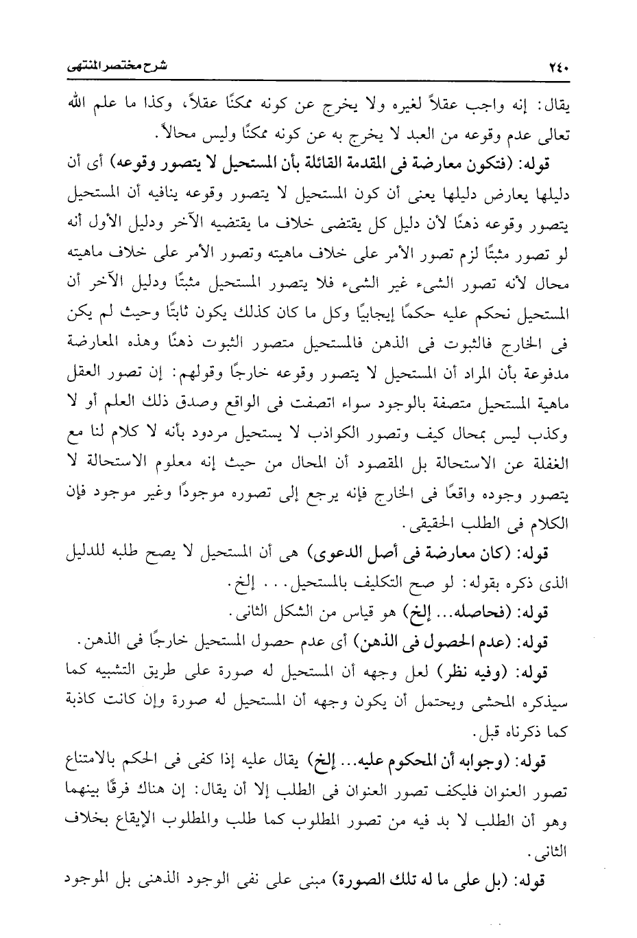 قوله: (فتكون معارضة فى المقدمة القائلة بأن المستحيل لا يتصور وقوعه) أى أن دليلها يعارض دليلها يعنى أن كون المستحيل لا يتصور وقوعه ينافيه أن المستحيل يتصور وقوعه ذهنًا لأن دليل كل يقتضى خلاف ما يقتضيه الآخر ودليل الأول أنه لو تصور مثبتًا لزم تصور الأمر على خلاف ماهيته وتصور الأمر على خلاف ماهيته محال لأنه تصور الشئ غير الشئ فلا يتصور المستحيل مثبتًا ودليل الآخر أن المستحيل نحكم عليه حكمًا إيجابيًا وكل ما كان كذلك يكون ثابتًا وحيث لم يكن فى الخارج فالثبوت فى الذهن فالمستحيل متصور الثبوت ذهنًا وهذه العارضة مدفوعة بأن المراد أن المستحيل لا يتصور وقوعه خارجًا وقولهم: إن تصور العقل ماهية المستحيل متصفة بالوجود سواء اتصفت فى الواقع وصدق ذلك العلم أو لا وكذب ليس بمحال كيف وتصور الكواذب لا يستحيل مردود بأنه لا كلام لنا مع الغفلة عن الاستحالة بل المقصود أن المحال من حيث إنه معلوم الاستحالة لا يتصور وجوده واقعًا فى الخارج فإنه يرجع إلى تصوره موجودًا وغير موجود فإن الكلام فى الطلب الحقيقى.