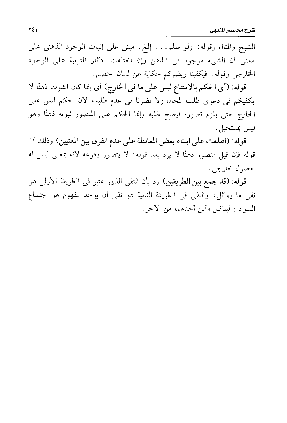 قوله: (قد جمع بين الطريقين) رد بأن النفى الذى اعتبر فى الطريقة الأولى هو نفى ما يماثل، والنفى فى الطريقة الثانية هو نفى أن يوجد مفهوم هو اجتماع السواد والبياض وأين أحدهما من الأخر.