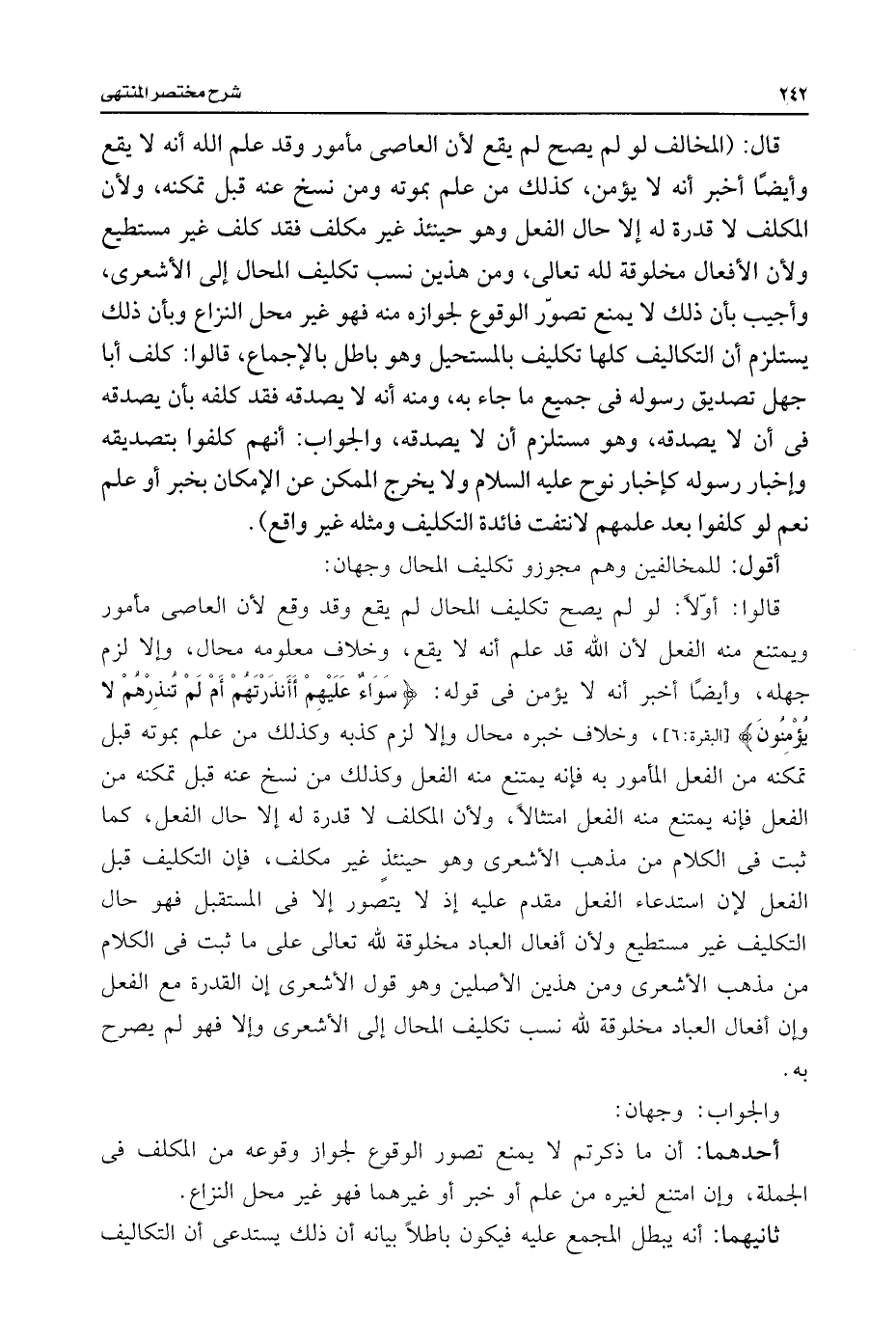 قال: (المخالف لو لم يصح لم يقع لأن العاصى مأمور وقد علم اللَّه أنه لا يقع وأيضًا أخبر أنه لا يؤمن، كذلك من علم بموته ومن نسخ عنه قبل تمكنه، ولأن المكلف لا قدرة له إلا حال الفعل وهو حينئذ غير مكلف فقد كلف غير مستطيع ولأن الأفعال مخلوقة للَّه تعالى، ومن هذين نسب تكليف المحال إلى الأشعرى، وأجيب بأن ذلك لا يمنع تصوّر الوقوع لجوازه منه فهو غير محل النزاع وبأن ذلك يستلزم أن التكاليف كلها تكليف بالمستحيل وهو باطل بالإجماع، قالوا: كلف أبا جهل تصديق رسوله فى جميع ما جاء به، ومنه أنه لا يصدقه فقد كلفه بأن يصدقه فى أن لا يصدقه، وهو مستلزم أن لا يصدقه، والجواب: أنهم كلفوا بتصديقه وإخبار رسوله كإخبار نوح عليه السلام ولا يخرج الممكن عن الإمكان بخبر أو علم نعم لو كلفوا بعد علمهم لانتفت فائدة التكليف ومثله غير واقع).
