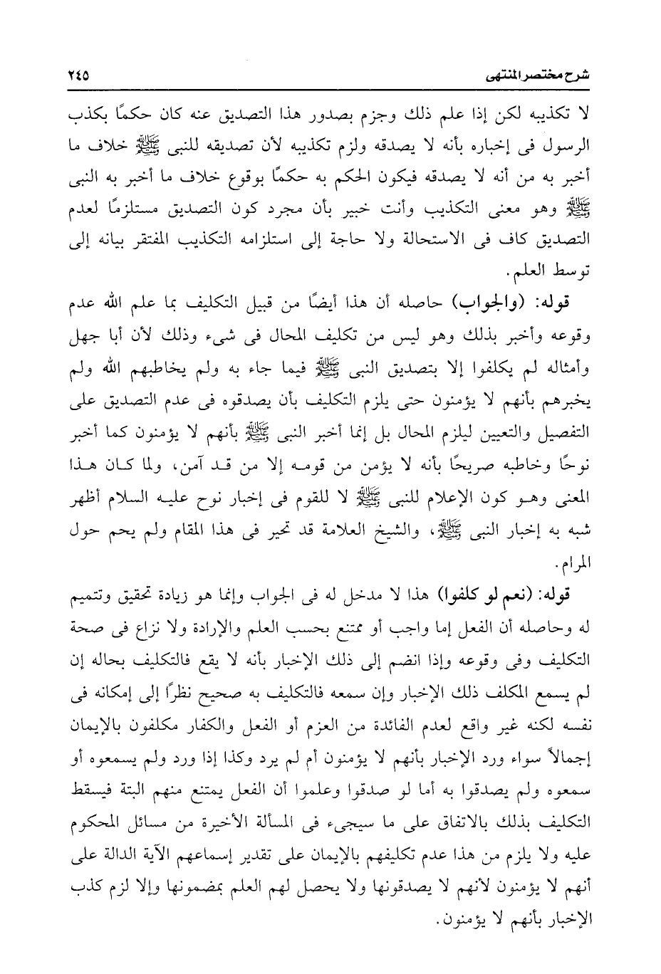 قوله: (والجواب) حاصله أن هذا أيضًا من قبيل التكليف بما علم اللَّه عدم وقوعه وأخبر بذلك وهو ليس من تكليف المحال فى شئ وذلك لأن أبا جهل وأمثاله لم يكلفوا إلا بتصديق النبى -صلى اللَّه عليه وسلم- فيما جاء به ولم يخاطبهم اللَّه ولم يخبرهم بأنهم لا يؤمنون حتى يلزم التكليف بأن يصدقوه فى عدم التصديق على التفصيل والتعيين ليلزم المحال بل إنما أخبر النبى -صلى اللَّه عليه وسلم- بأنهم لا يؤمنون كما أخبر نوحًا وخاطبه صريحًا بأنه لا يؤمن من قومه إلا من قد آمن، ولما كان هذا المعنى وهو كون الإعلام للنبى -صلى اللَّه عليه وسلم- لا للقوم فى إخبار نوح عليه السلام أظهر شبه به إخبار النبى -صلى اللَّه عليه وسلم-، والشيخ العلامة قد تحير فى هذا المقام ولم يحم حول المرام.