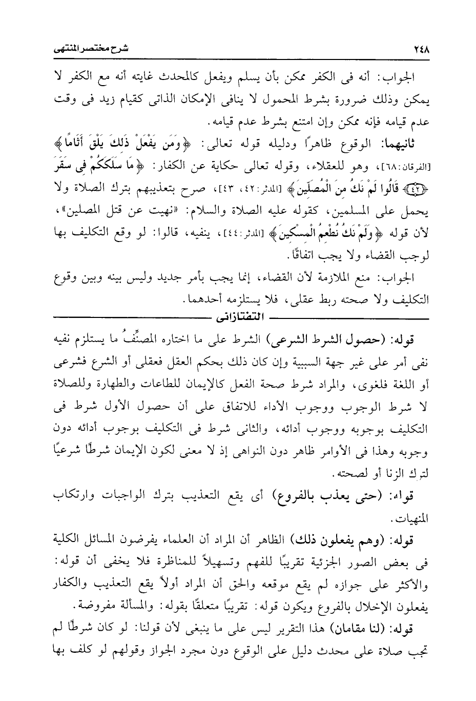 ثانيهما: الوقوع ظاهرًا ودليله قوله تعالى: {وَمَنْ يَفْعَلْ ذَلِكَ يَلْقَ أَثَامًا} [الفرقان: ٦٨]، وهو للعقلاء، وقوله تعالى حكاية الكفار: {مَا سَلَكَكُمْ فِي سَقَرَ (٤٢) قَالُوا لَمْ نَكُ مِنَ الْمُصَلِّينَ} [المدثر: ٤٢, ٤٣]، صرح بتعذيبهم بترك الصلاة ولا يحمل على المسلمين، كقوله عليه الصلاة والسلام: "نهيت عن قتل المصلين"، لأن قوله {وَلَمْ نَكُ نُطْعِمُ الْمِسْكِين} [المدثر: ٤٤]، ينفيه، قالوا: لو وقع التكليف بها لوجب القضاء ولا يجب اتفاقًا.