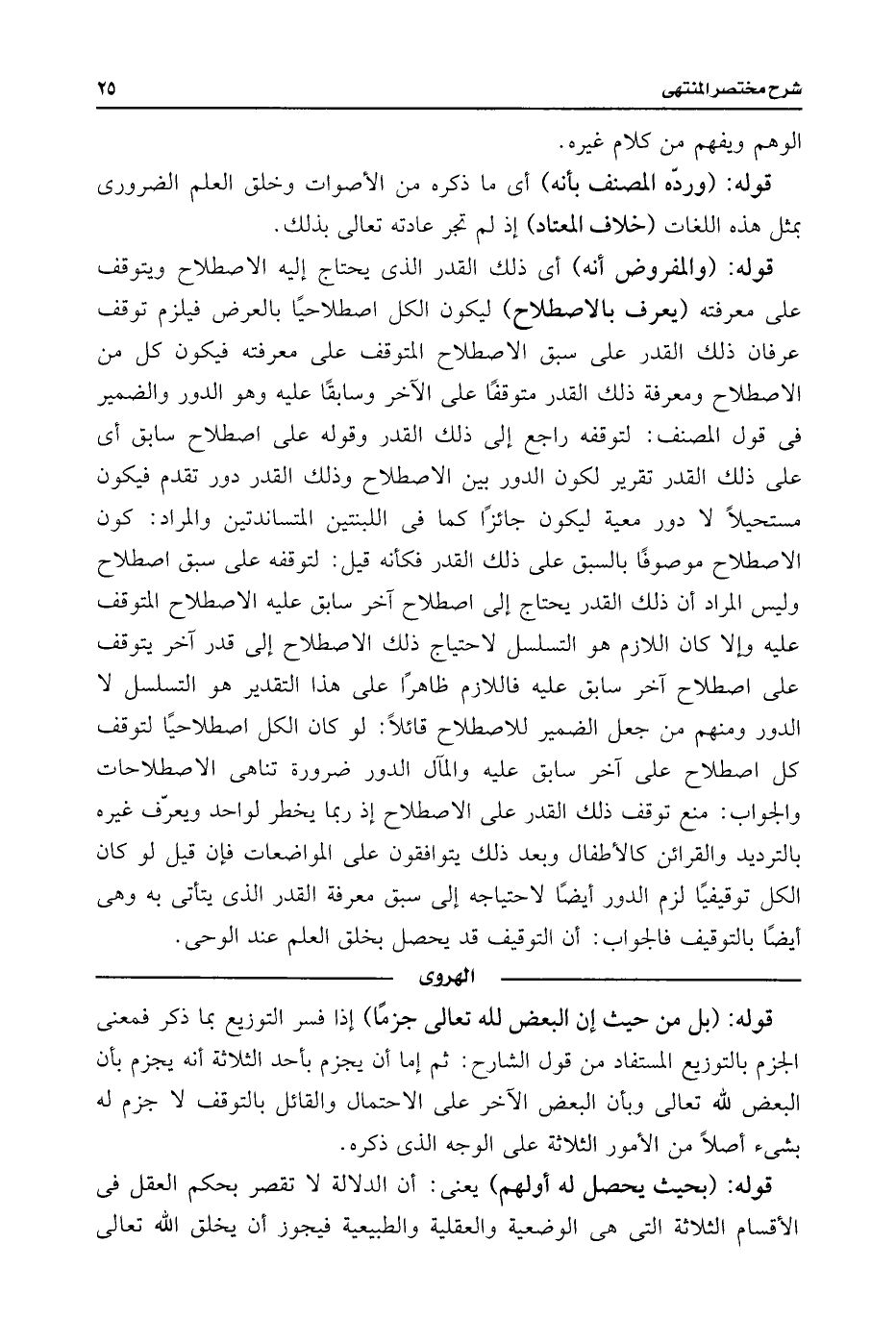 قوله: (والمفروض أنه) أى ذلك القدر الذى يحتاج إليه الاصطلاح ويتوقف على معرفته (يعرف بالاصطلاح) ليكون الكل اصطلاحيًا بالعرض فيلزم توقف عرفان ذلك القدر على سبق الاصطلاح المتوقف على معرفته فيكون كل من الاصطلاح ومعرفة ذلك القدر متوقفًا على الآخر وسابقًا عليه وهو الدور والضمير فى قول المصنف: لتوقفه راجع إلى ذلك القدر وقوله على اصطلاح سابق أى على ذلك القدر تقرير لكون الدور بين الاصطلاح وذلك القدر دور تقدم فيكون مستحيلًا لا دور معية ليكون جائزًا كما فى اللبنتين المتساندتين والمراد: كون الاصطلاح موصوفًا بالسبق على ذلك القدر فكأنه قيل: لتوقفه على سبق اصطلاح وليس المراد أن ذلك القدر يحتاج إلى اصطلاح آخر سابق عليه الاصطلاح المتوقف عليه وإلا كان اللازم هو التسلسل لاحتياج ذلك الاصطلاح إلى قدر آخر يتوقف على اصطلاح آخر سابق عليه فاللازم ظاهرًا على هذا التقدير هو التسلسل لا الدور ومنهم من جعل الضمير للاصطلاح قائلًا: لو كان الكل اصطلاحيًا لتوقف كل اصطلاح على آخر سابق عليه والمآل الدور ضرورة تناهى الاصطلاحات والجواب: منع توقف ذلك القدر على الاصطلاح إذ ربما يخطر لواحد ويعرّف غيره بالترديد والقرائن كالأطفال وبعد ذلك يتوافقون على المواضعات فإن قيل لو كان الكل توقيفيًا لزم الدور أيضًا لاحتياجه إلى سبق معرفة القدر الذى يتأتى به وهى أيضًا بالتوقيف فالجواب: أن التوقيف قد يحصل بخلق العلم عند الوحى.